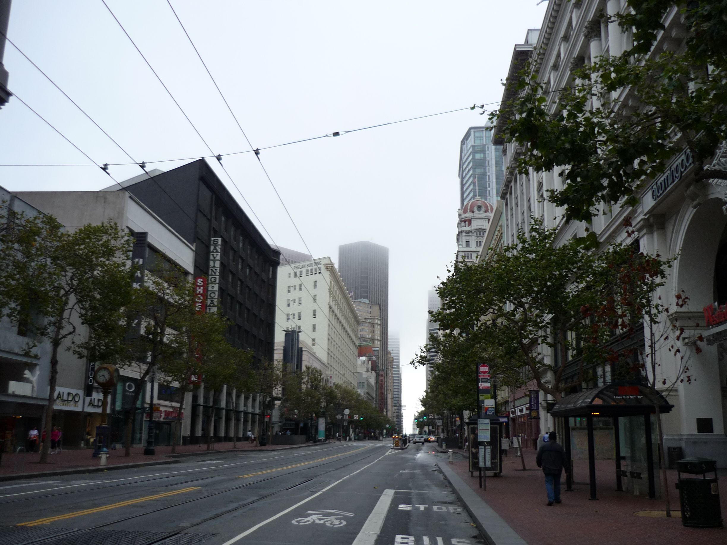 Le temps n’est pas terrible : couvert et froid, un mélange de brouillard et de vent. Heureusement que j’ai prévu un pull ! Après avoir envoyé quelques mails (heureusement que le WiFi est allumé tout le temps et que j’ai mon iPod Touch, l’Apple Store est fermé de si bon matin …), je vais m’acheter un pass Muni de 7 jours. C’est une simple carte sur laquelle il faut gratter les jours durant lesquels on souhaite l’utiliser, comme sur un jeu de hasard. Bonne idée mais ça fait vraiment bizarre…