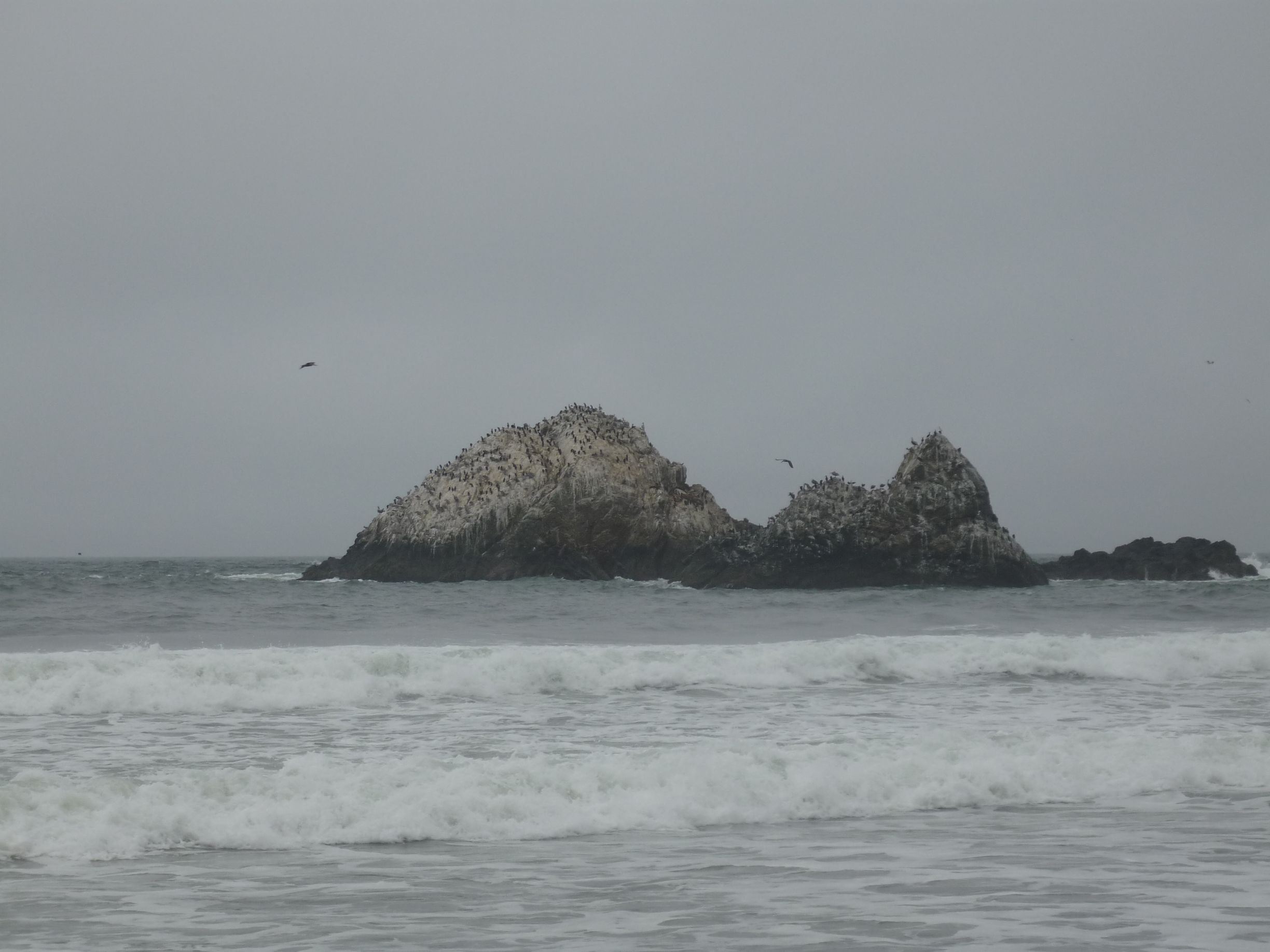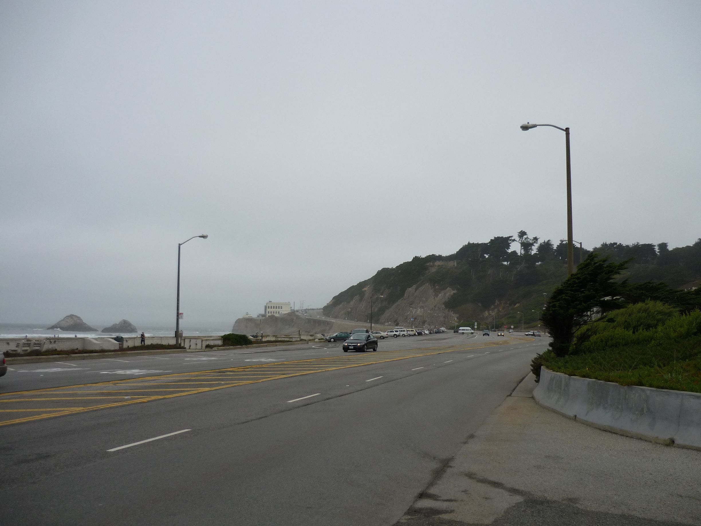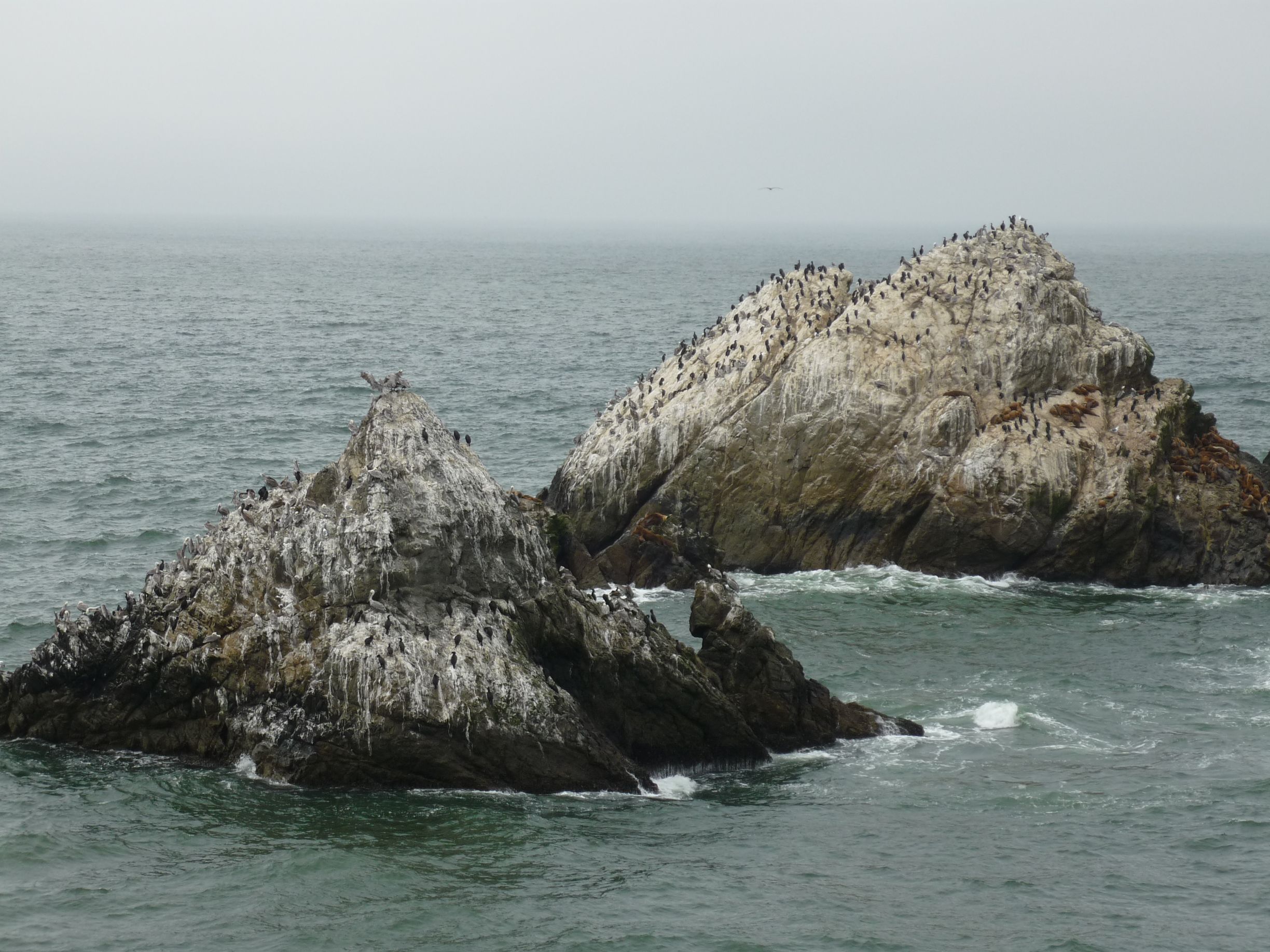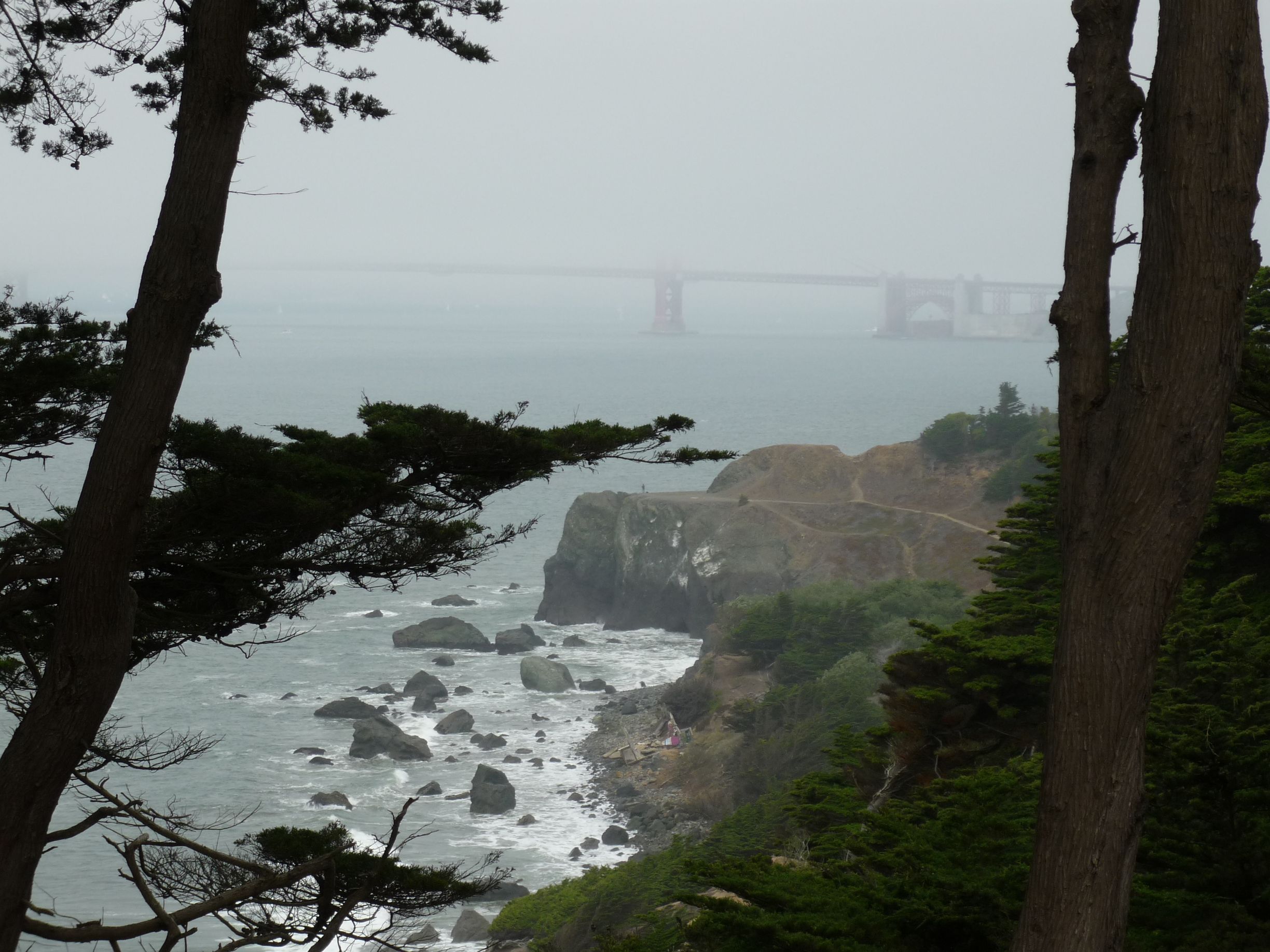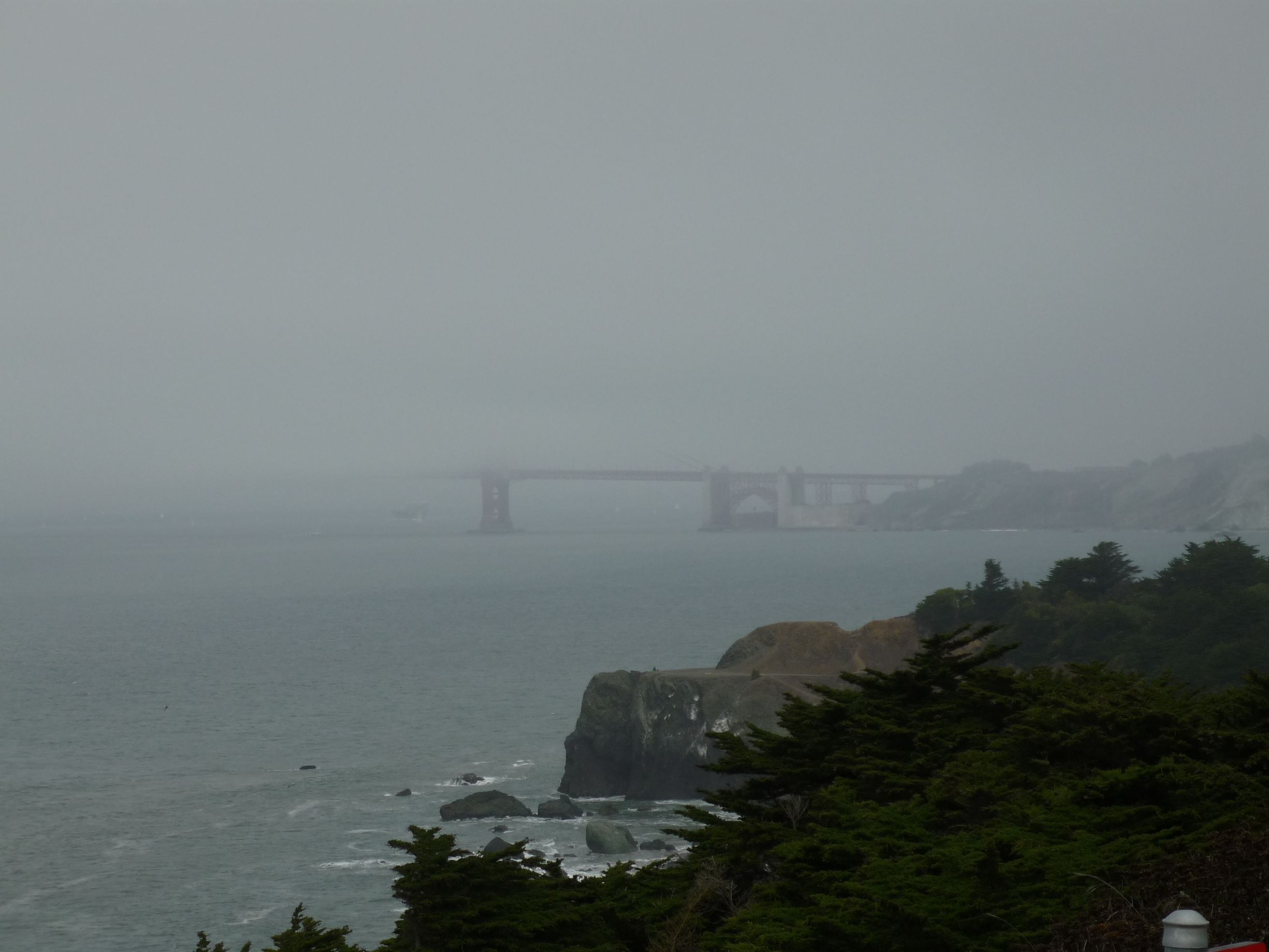 Je commence à avoir faim, tout ce vent et cette marche m’ont bien ouvert l’appétit ! Un diner très sympa, Loui’s, me tend les bras. J’y mange un grilled ham & cheese sandwich et un excellent cheesecake pour 15$. En ressortant, je longe la côte par un petit chemin très agréable avec une superbe vue sur le Golden Gate Bridge. Au moment où j’écris ça, je suis assis sur un banc, face à la mer, avec à ma droite le Golden Gate et le son intermittent d’une sirène qui prévient les bateaux à cause du brouillard. Il y a également plein de phoques qui sont assez bruyants, posés sur les gros rochers et autres ilôts qui parsèment la côte.