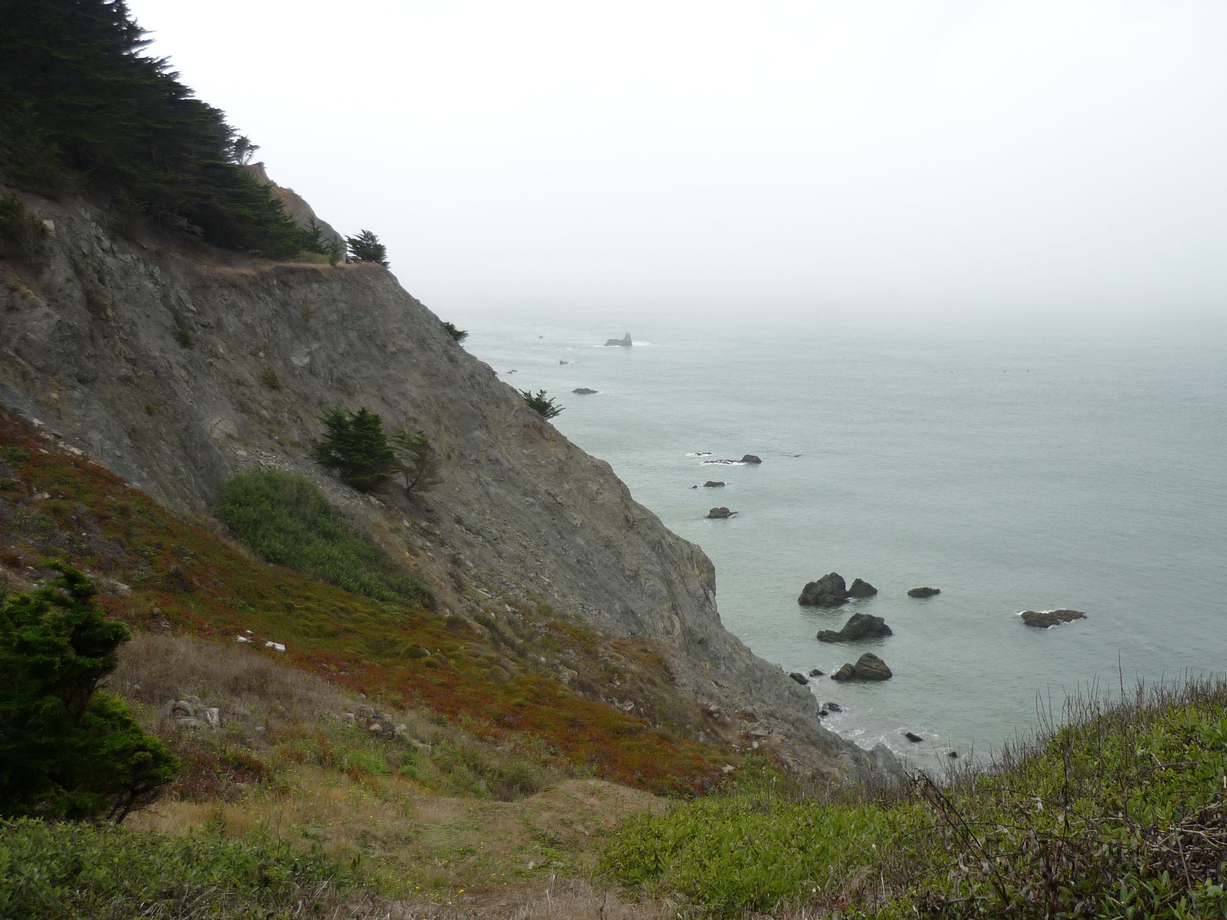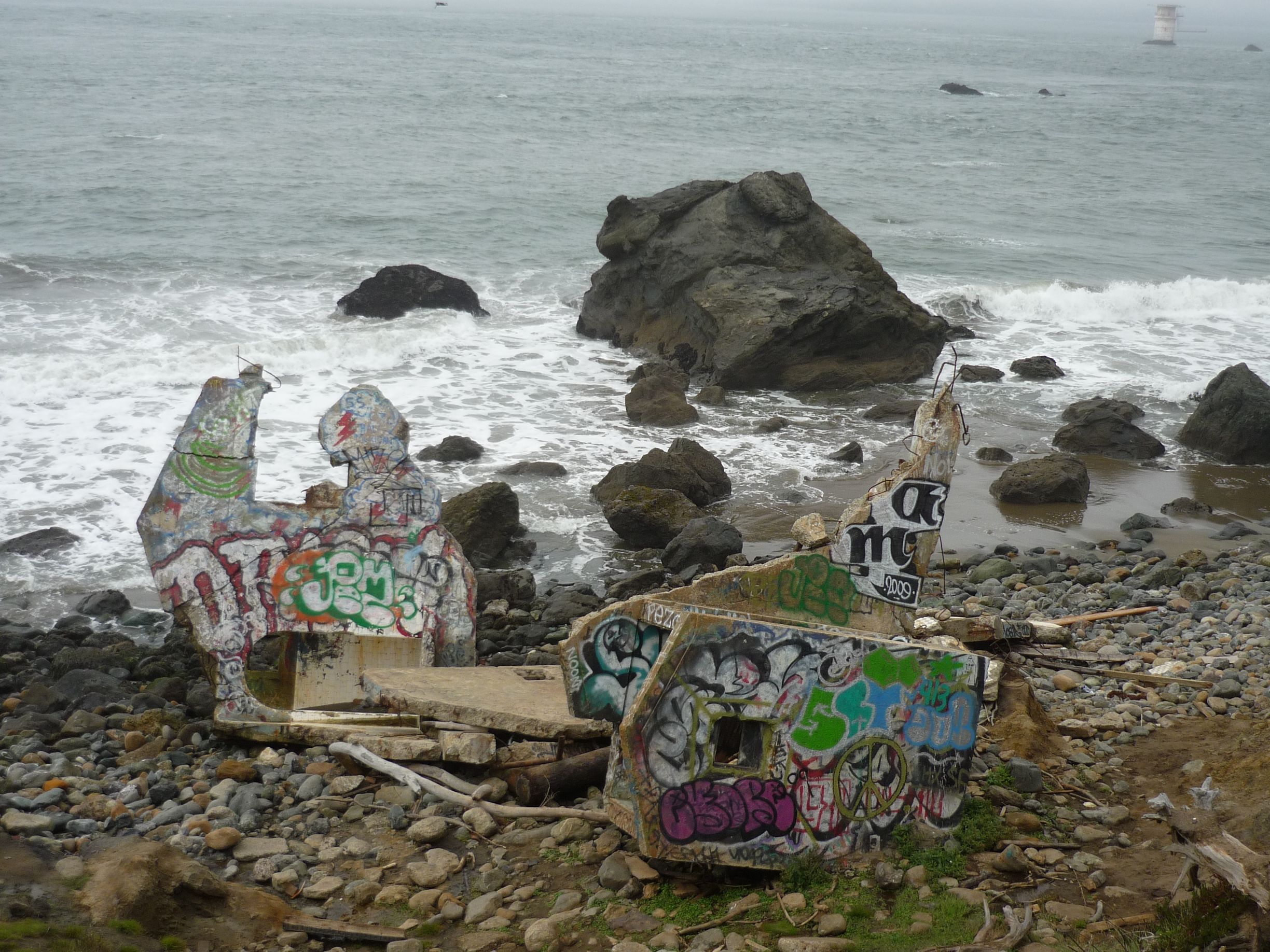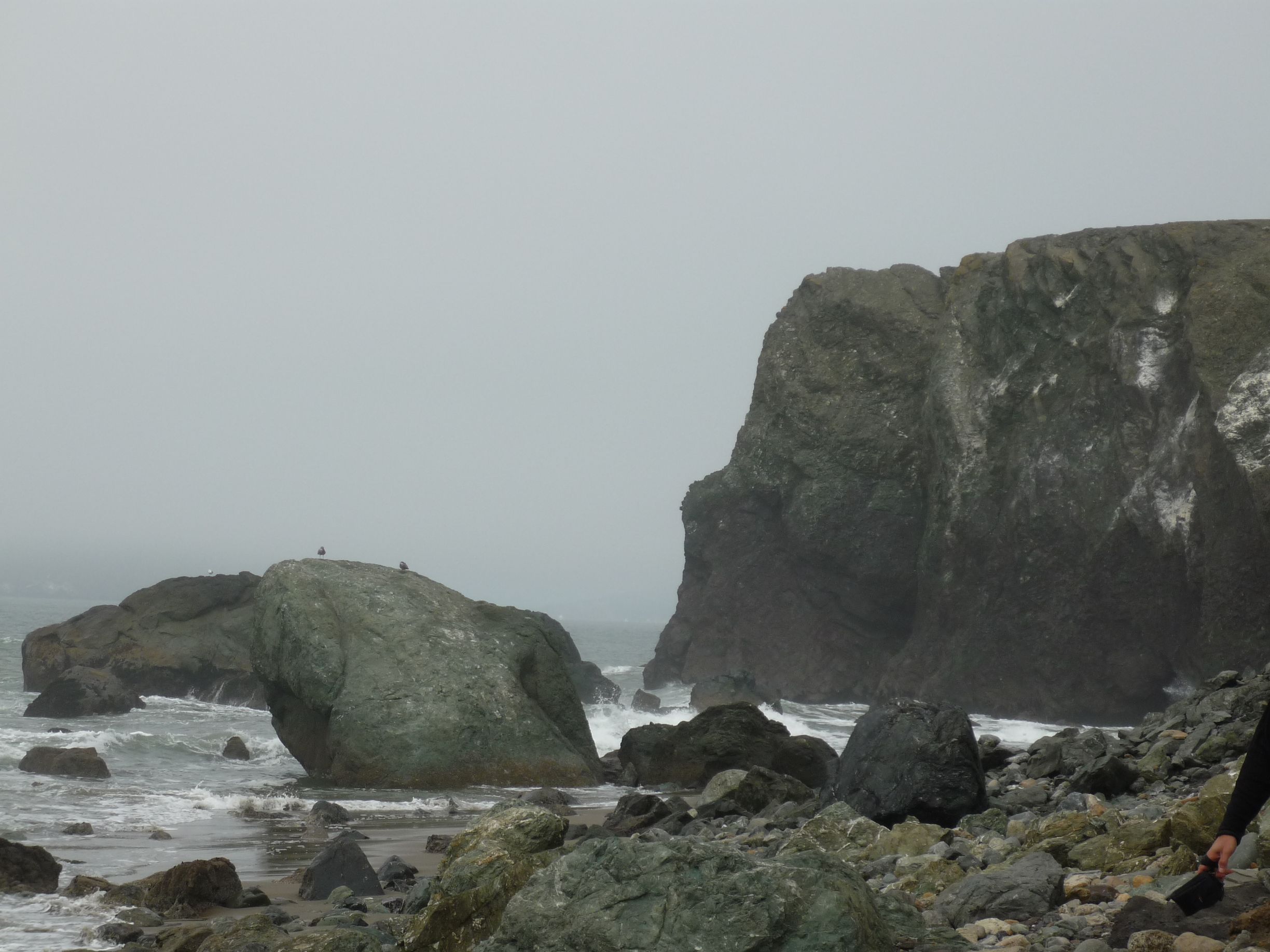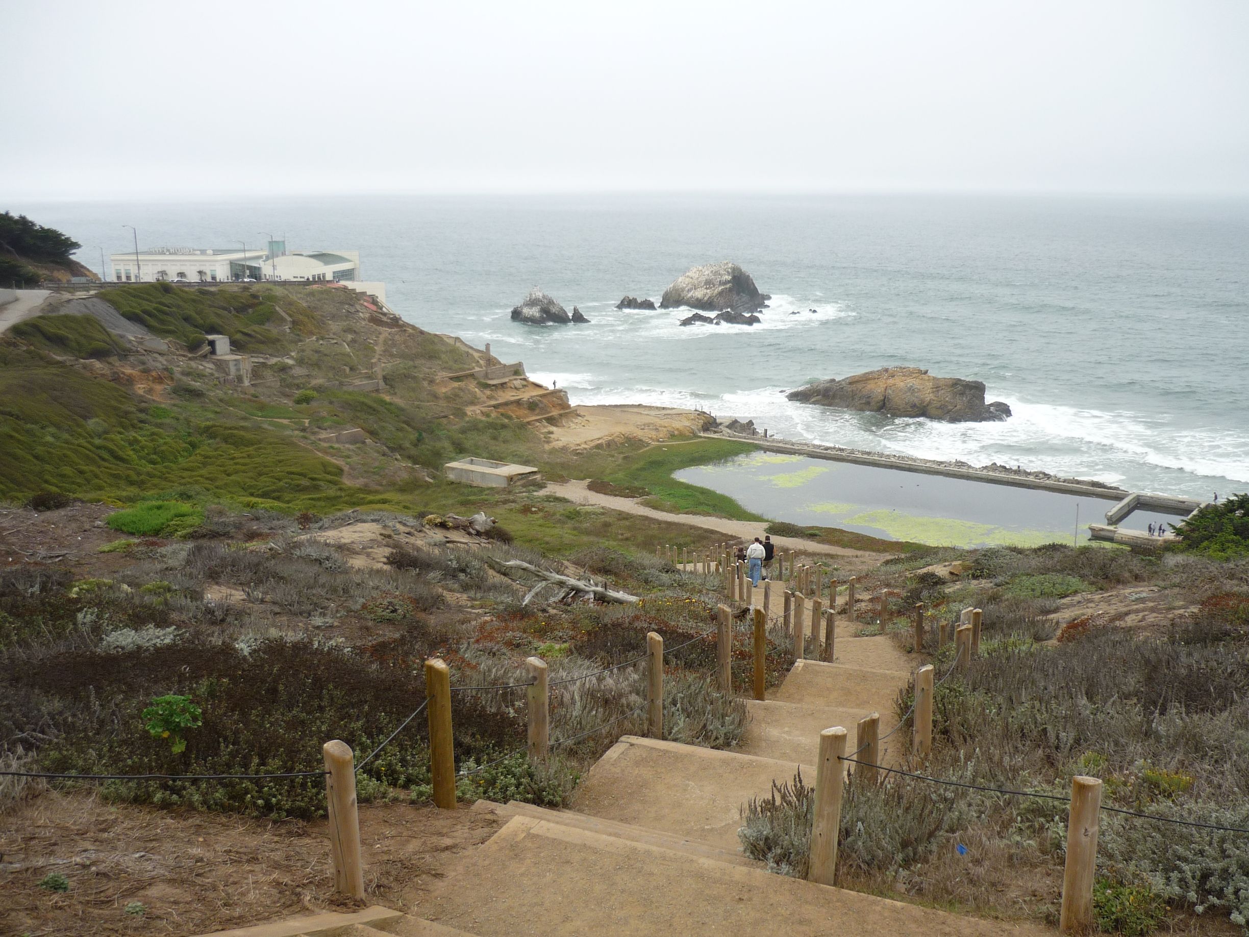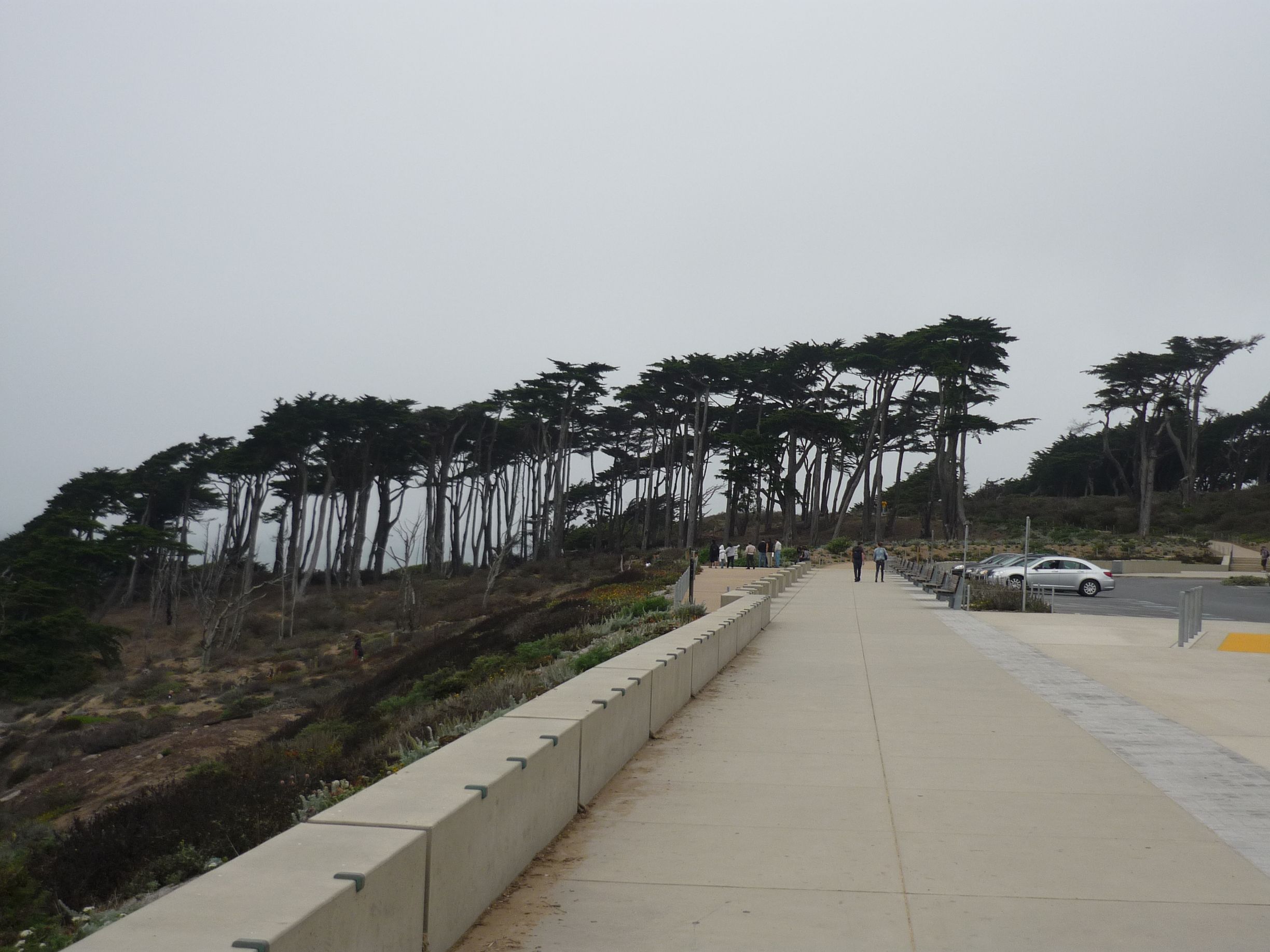 Je commence à avoir faim, tout ce vent et cette marche m’ont bien ouvert l’appétit ! Un diner très sympa, Loui’s, me tend les bras. J’y mange un grilled ham & cheese sandwich et un excellent cheesecake pour 15$. En ressortant, je longe la côte par un petit chemin très agréable avec une superbe vue sur le Golden Gate Bridge. Au moment où j’écris ça, je suis assis sur un banc, face à la mer, avec à ma droite le Golden Gate et le son intermittent d’une sirène qui prévient les bateaux à cause du brouillard. Il y a également plein de phoques qui sont assez bruyants, posés sur les gros rochers et autres ilôts qui parsèment la côte.