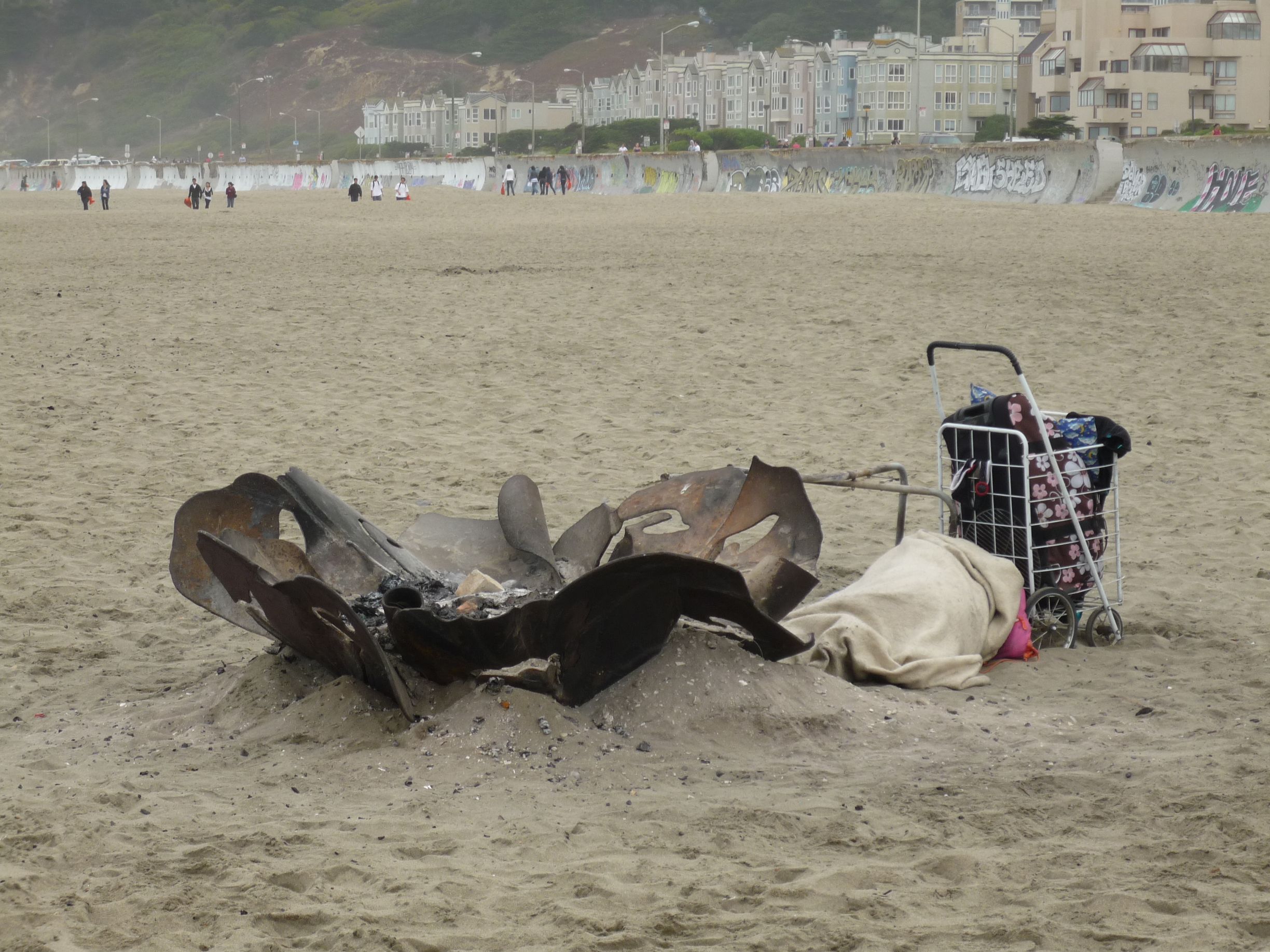 Je continue de marcher jusqu’à la 25e avenue pour tenter de prendre un bus, mais le temps d’attente est vraiment trop long… Je remonte alors la 25e jusqu’à Fulton St. (le long du Golden Gate Park) et prend le premier bus 5 qui passe. Évidemment il ne va pas dans la bonne direction et je me retrouve à nouveau sur Ocean Beach. J’en profite pour faire une petite sieste, venteuse et fraîche.