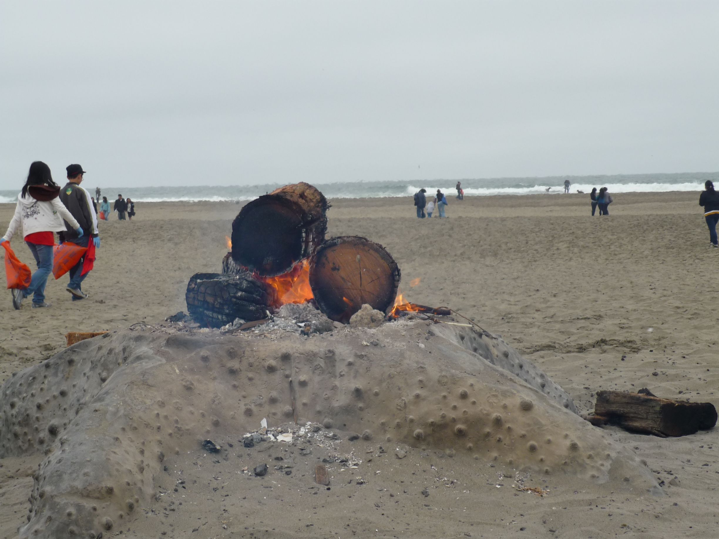 Les bus fonctionnent avec une caténaire, comme une sorte de tramway sans rails. Par contre ils ne sont pas très fiables : dans tous ceux que j’ai pris le conducteur a dû s’arrêter pour réparer quelque chose… Après environ 30 minutes de bus, j’arrive à La Playa. Chose étonnante, il est à peine 10h et la plage est pleine de monde. J’apprends rapidement par un panneau qu’aujourd’hui c’est le cleanup day : tout le monde qui veut prend un sac plastique et ramasse les déchets sur la plage. Je comprends mieux pourquoi elle est si propre… Il y a par ailleurs plusieurs endroits prévus pour y faire un feu, dans certains un feu est même encore bien actif. Ça doit être sympa la nuit ! Je suis d’ailleurs en ce moment en train d’écrire ces pages auprès d’un feu, avec le bruit de la mer en fond et la musique qui sort des hauts parleurs du DJ recruté pour l’occasion.