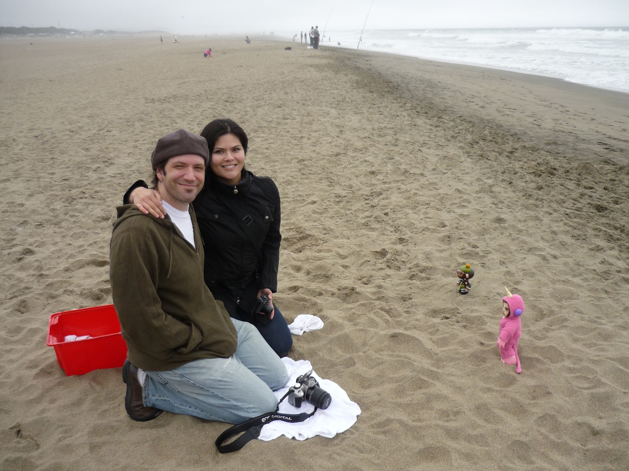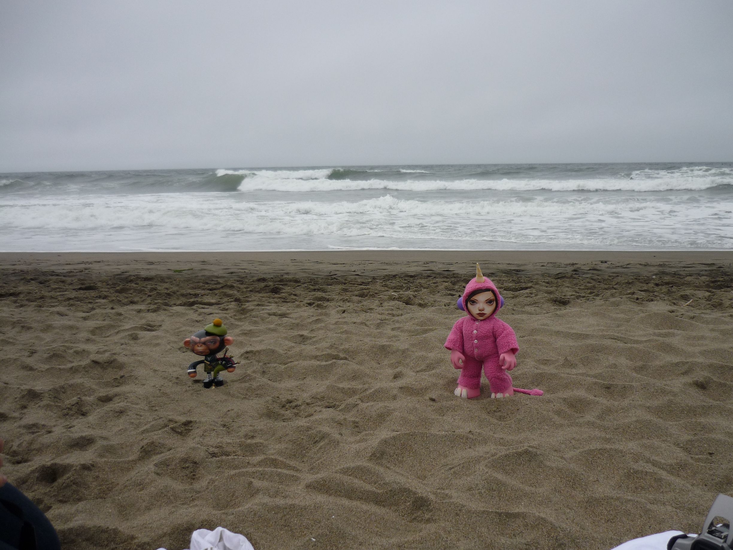 Je repars ensuite longer les vagues mourant sur le sable, balade très agréable ! Je tombe sur deux jeunes prenant en photo des sortes de poupées « customisées » : l’une représente un singe habillé en kilt avec une cornemuse et l’autre une sorte de Teletubby rose avec une tête humaine. Je leur parle quelques temps, l’artiste s’appelle Ken Keims et il me laisse sa carte. Lui et sa copine sont très sympas, cette dernière vit à côté d’Ocean Beach alors que Ken vit à Chicago. Je les prends en photo pour le souvenir…