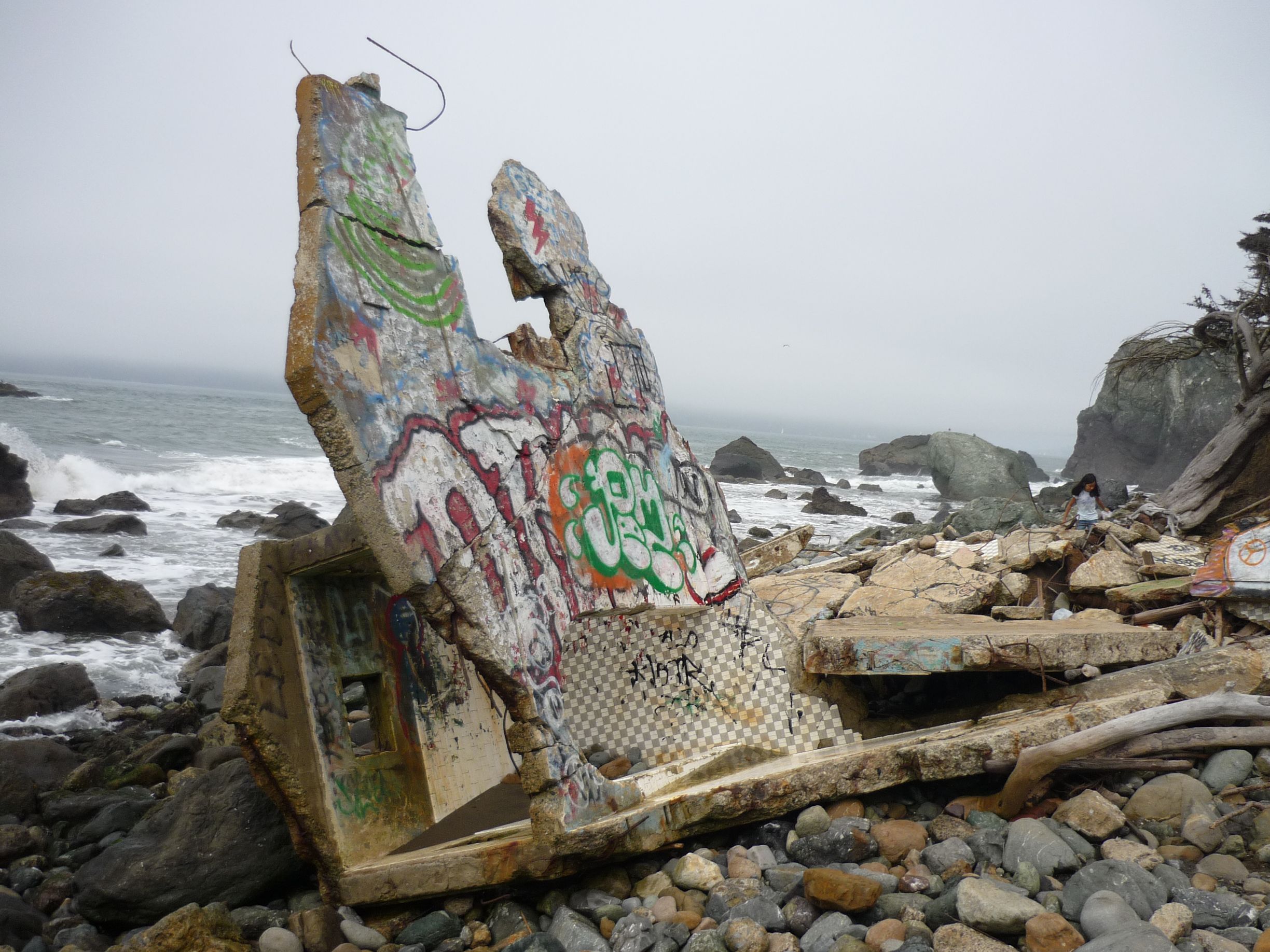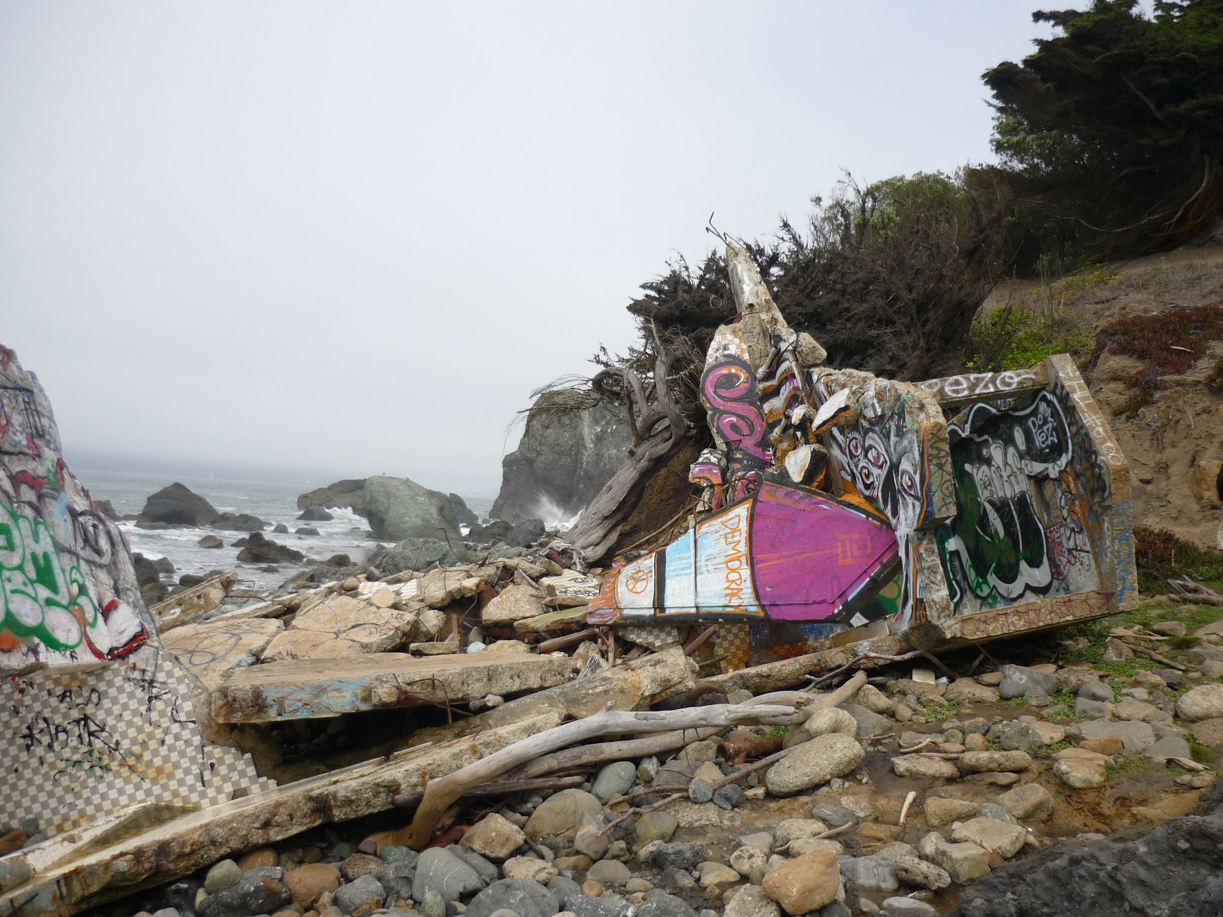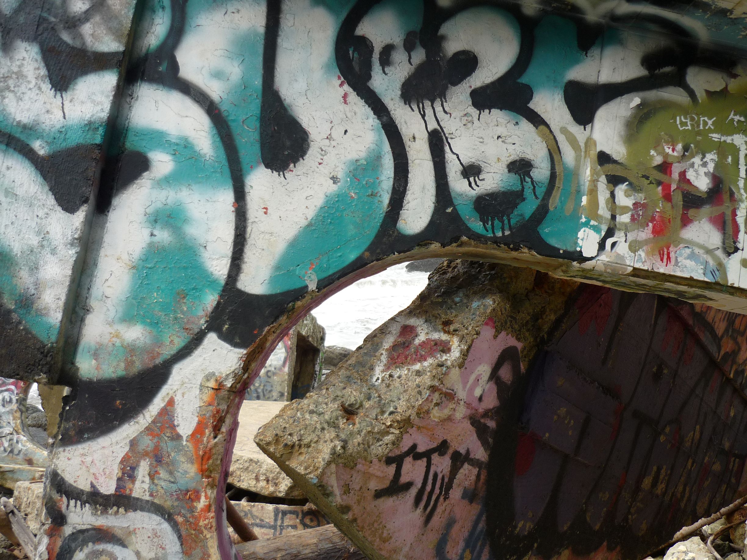 Je continue ensuite la balade le long de la côte, avec des paysages vraiment magnifiques. À un moment, je vois un chemin s’enfoncer dans le côté « sauvage », descendant vers la mer. Le genre de chemin tracé par les pas des hommes qui l’ont emprunté. Je décide alors de le suivre et passe à travers bosquets de bambous, arbustes et arbres, ce qui devait probablement être l’aspect de tout cet endroit il y a 300 ans. Après quelques minutes de marche, je croise une personne qui m’indique que la destination finale de ce chemin est une plage de rochers. En effet, quelques minutes plus tard, j’arrive sur une « plage » désolée. Les vagues qui explosent contre quelques gros rochers et l’absence de toute autre personne donnent vraiment à cet endroit une ambiance particulière ! Un peu plus loin, à droite, je repère une sorte de maison cassée en plusieurs morceaux, tous plus tagués les uns que les autres… Probablement les suites d’un glissement de terrain… Je décide ensuite de prendre une nouvelle route pour récupérer le chemin principal. Après m’être un peu perdu, je reviens enfin à la civilisation !