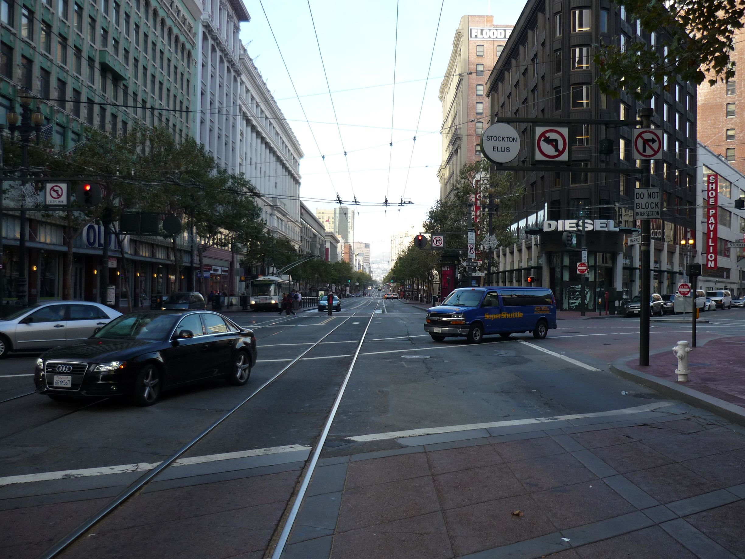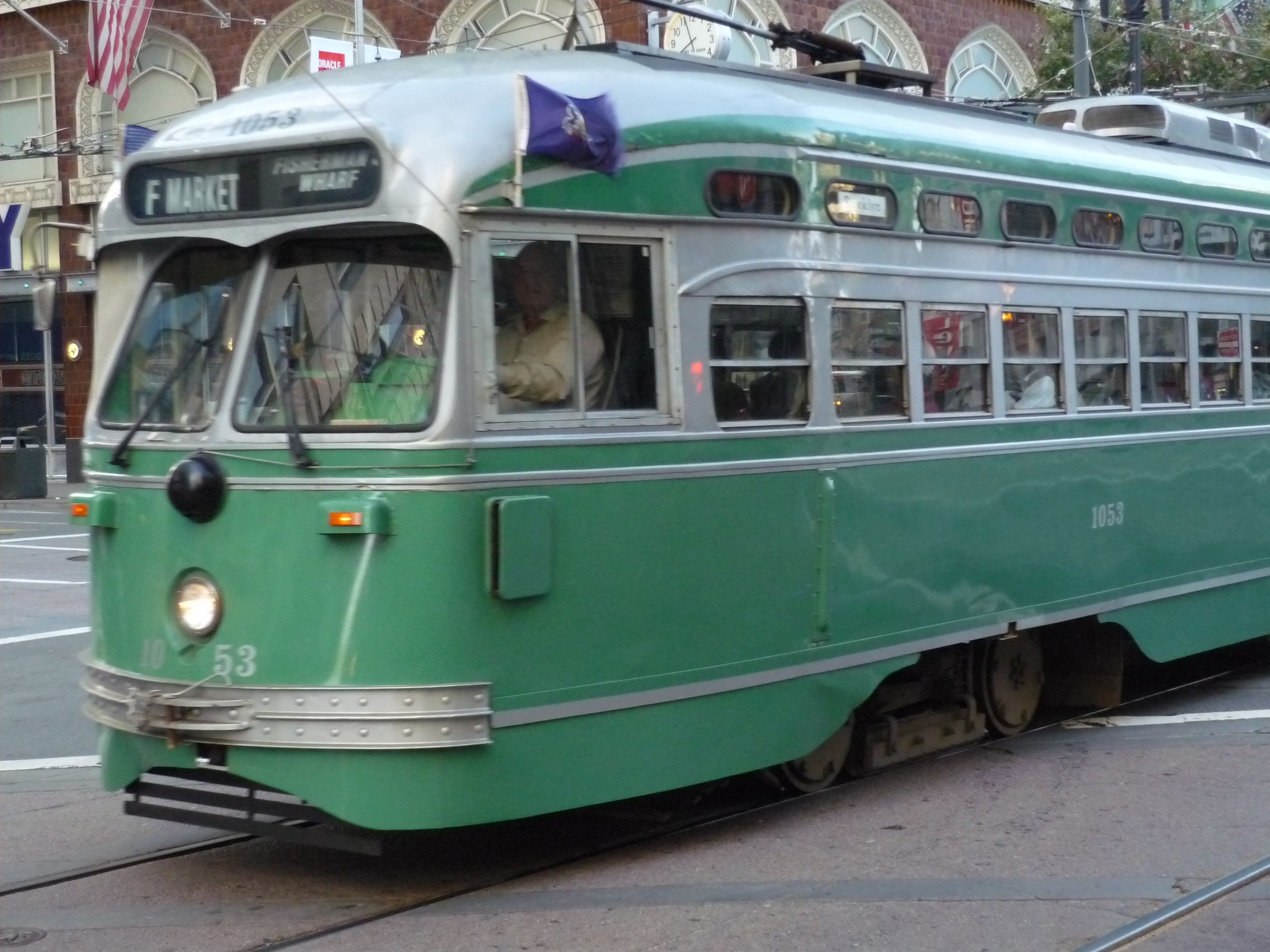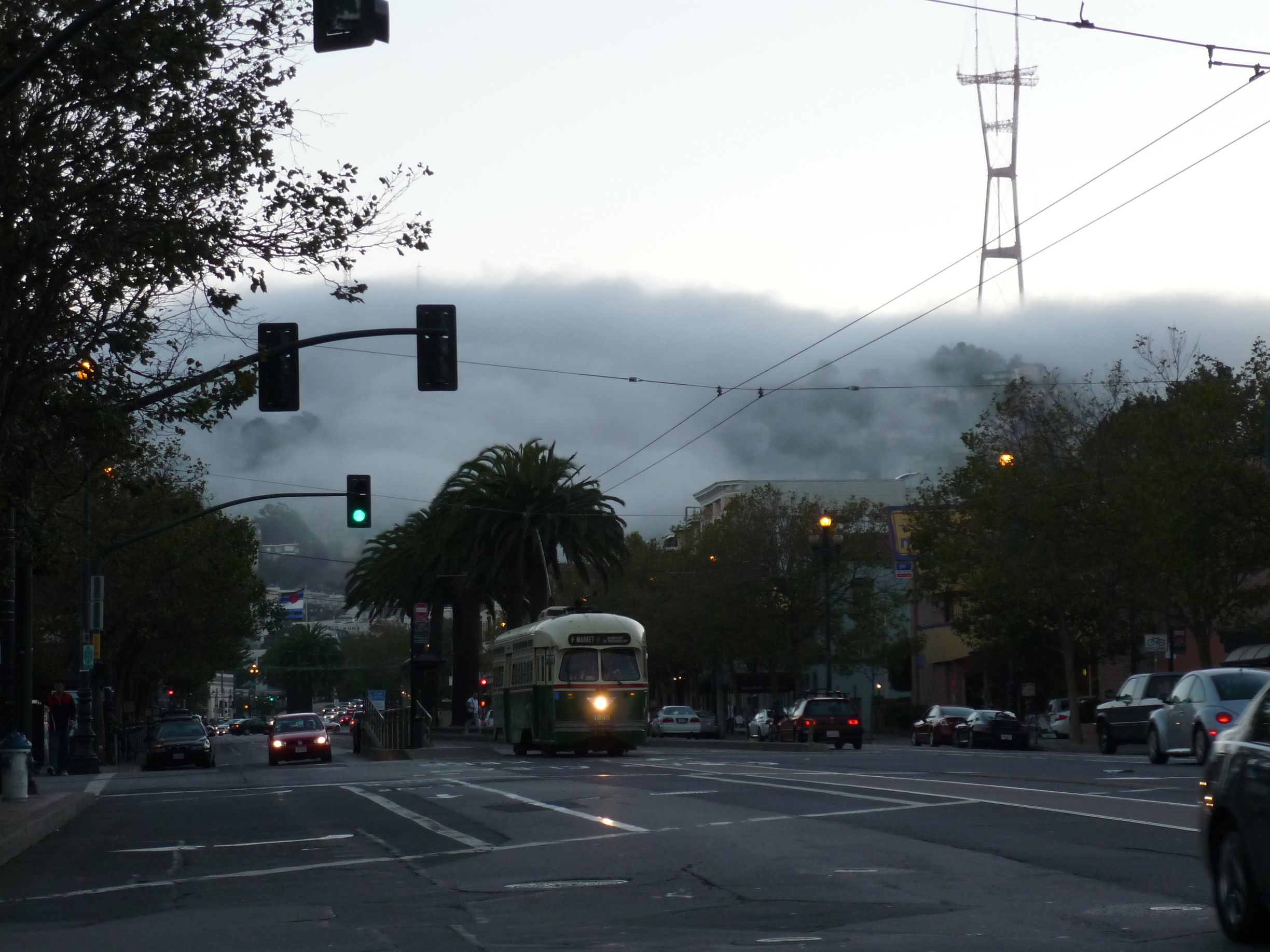 Je commence à en avoir marre de marcher et décide de prendre le Muni. Une sorte de vieux tramway remonte tout Market Street jusqu’aux Wharves, la ligne F. Je l’attend et en profite pour sortir le livre sur Noam Chomsky que j’ai acheté dans la librairie anarchiste (tenue par des bénévoles) de Haight Street. Après au moins 15 minutes d’attente le wagon métallique arrive, on l’entend de loin… La rame est bien pleine mais je trouve tout de même une place pour m’asseoir.
