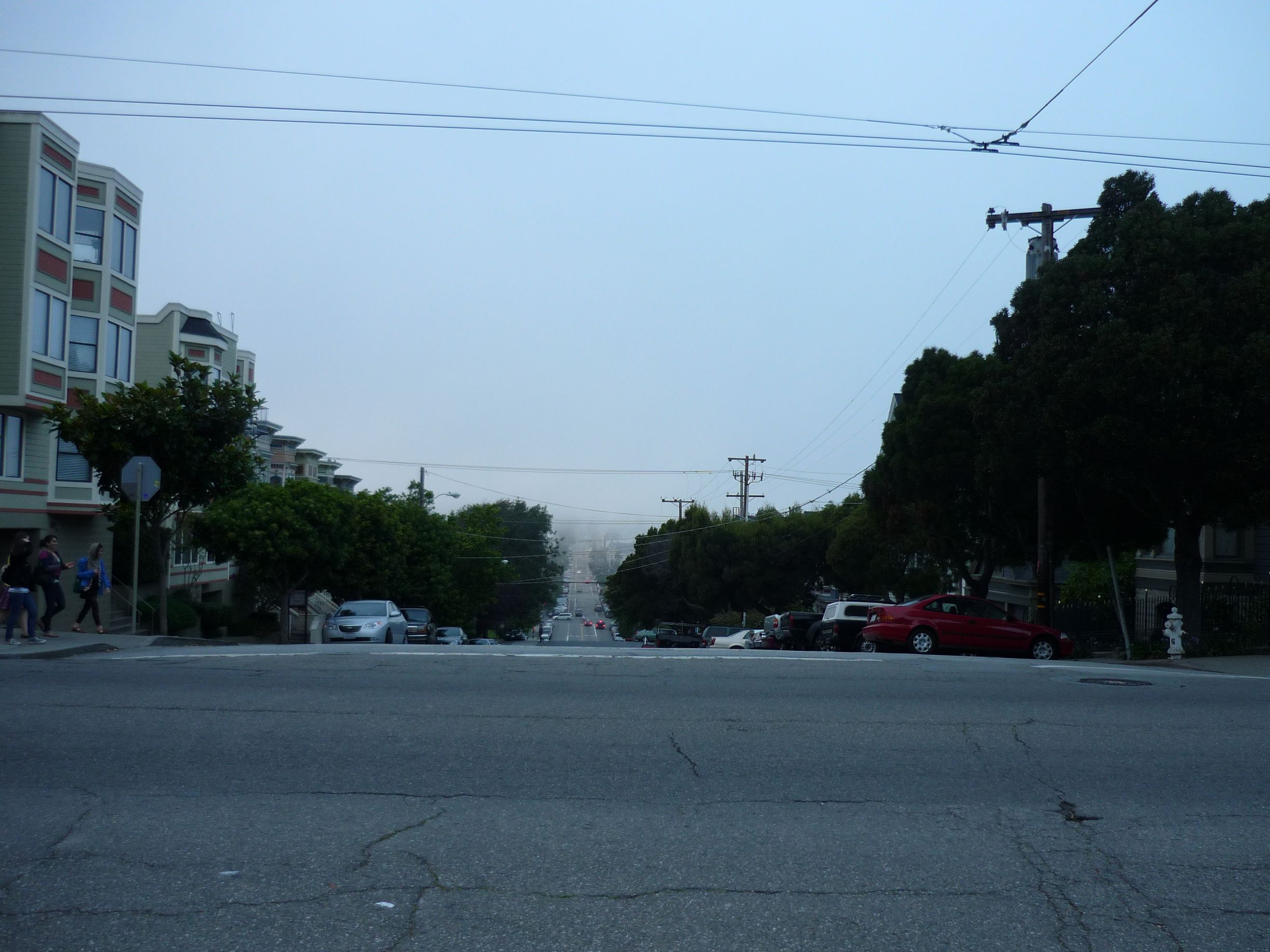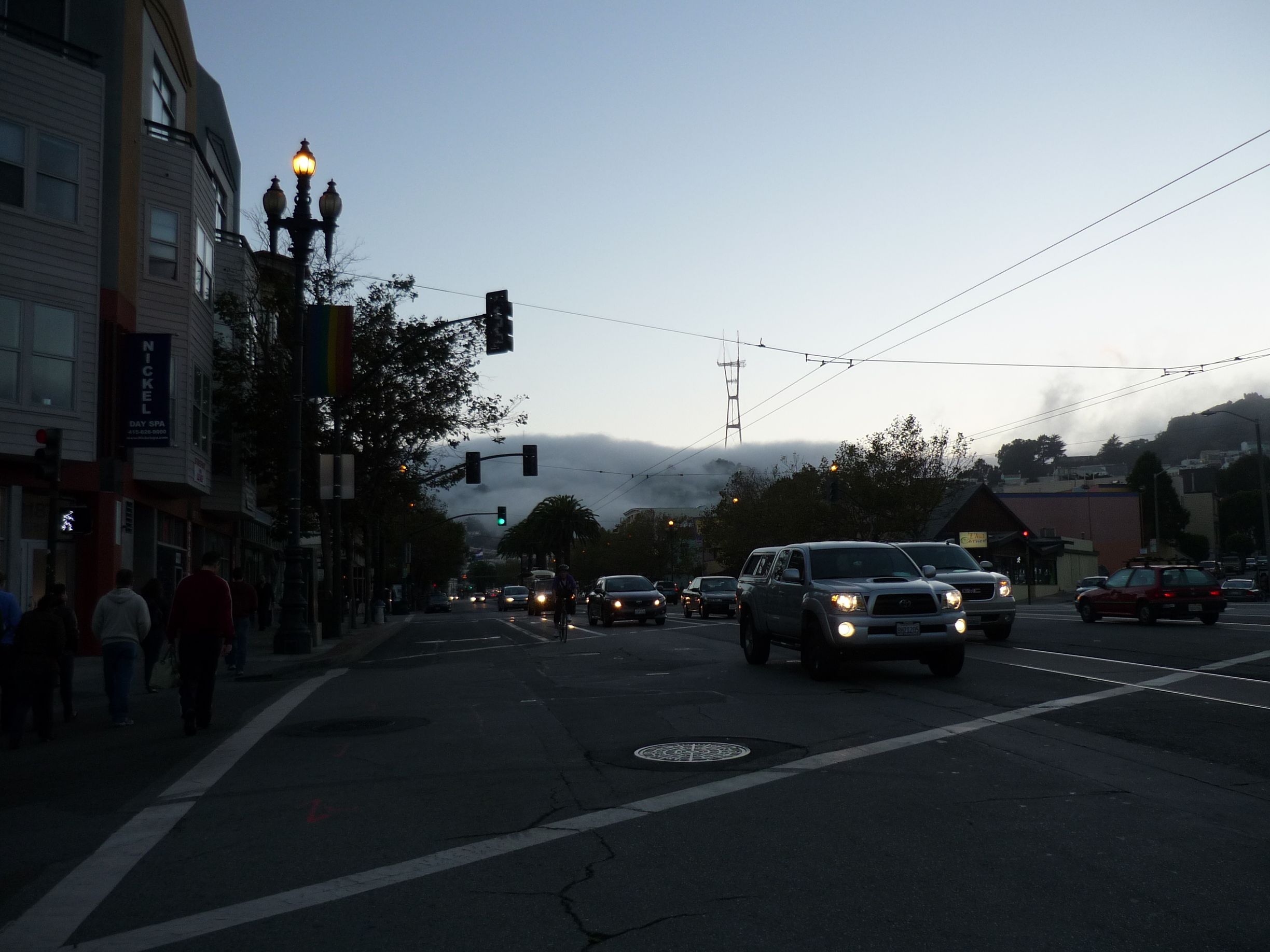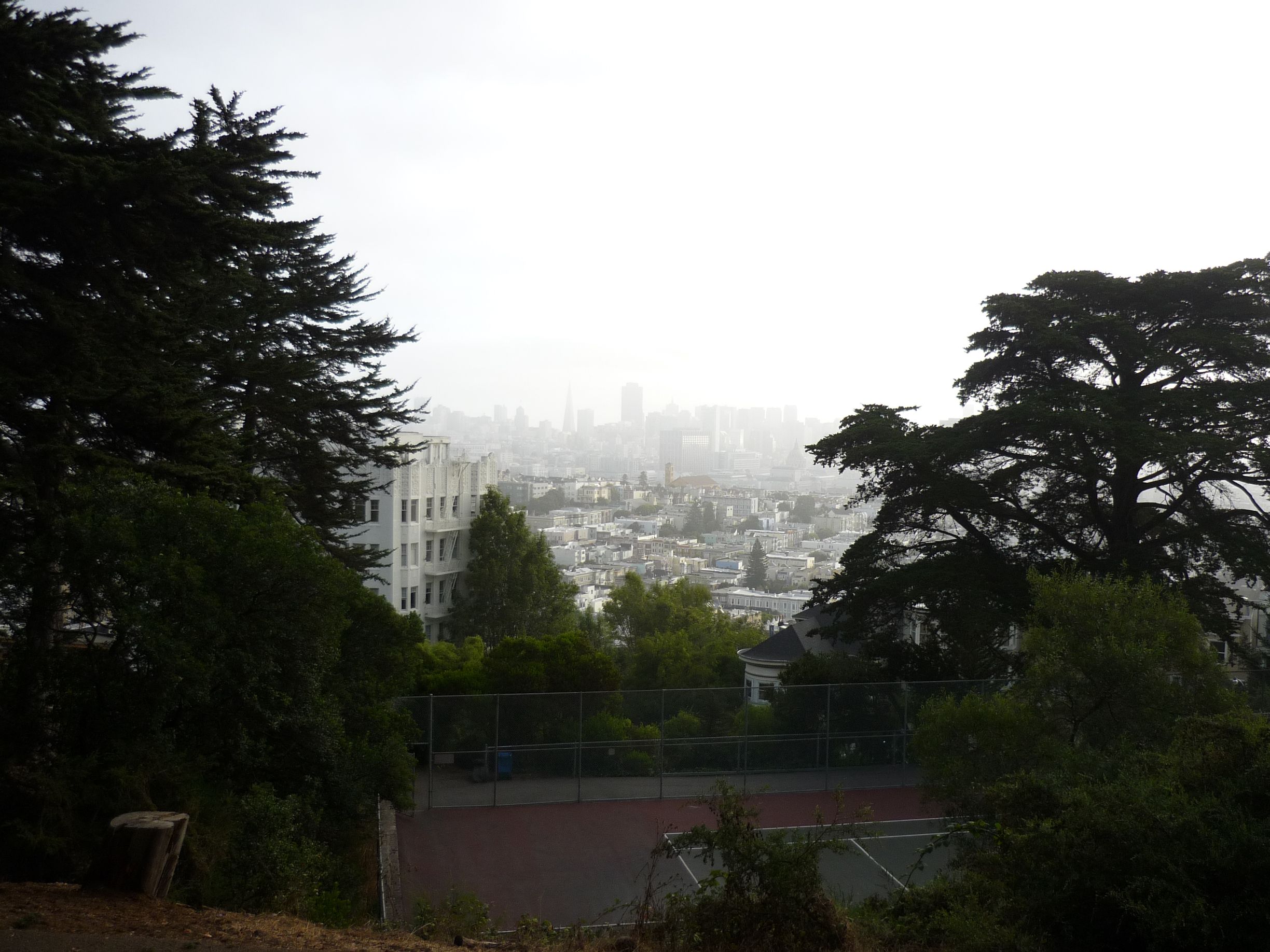 Le temps dehors a changé : il y a du vent et le fameux fog commence à s’installer. Au niveau du Buena Vista Park, je suis obligé de remettre mon pull. Arrivé à Duboce Park, il fait carrément froid ! Le vent pousse le brouillard qui, en plus de cacher le soleil, ajoute de l’humidité. On peut voir distinctement le brouillard descendre la côte au niveau de ce parc, c’est vraiment impressionnant. J’avais bien lu que le temps pouvait changer très vite à San Francisco, mais je n’aurais jamais pensé que c’était à ce point ! La vidéo que j’ai pris dans le parc ne rend pas bien l’effet que cela fait en vrai…