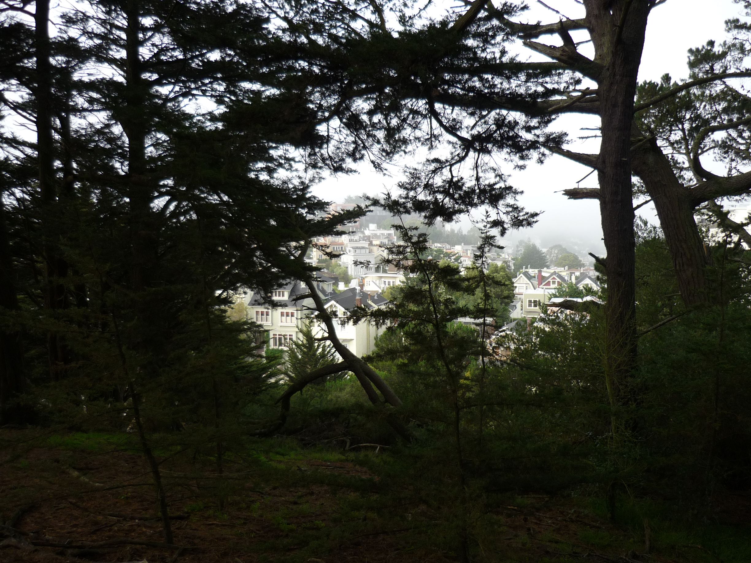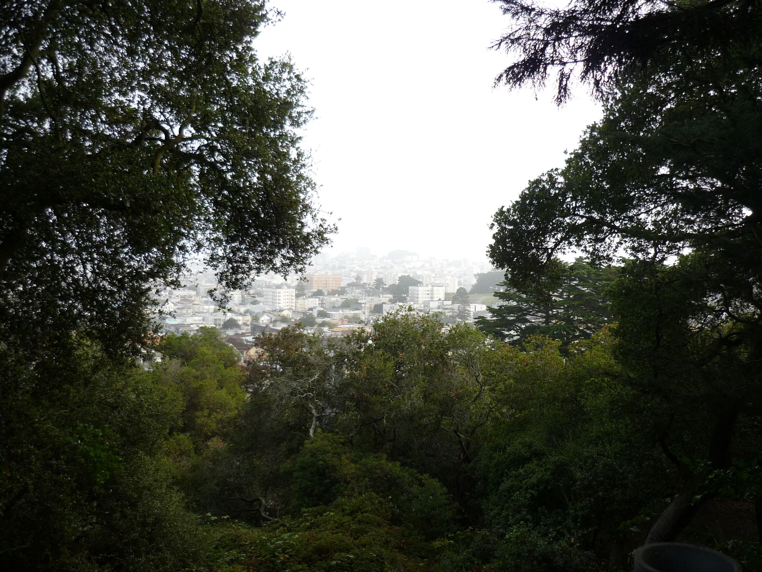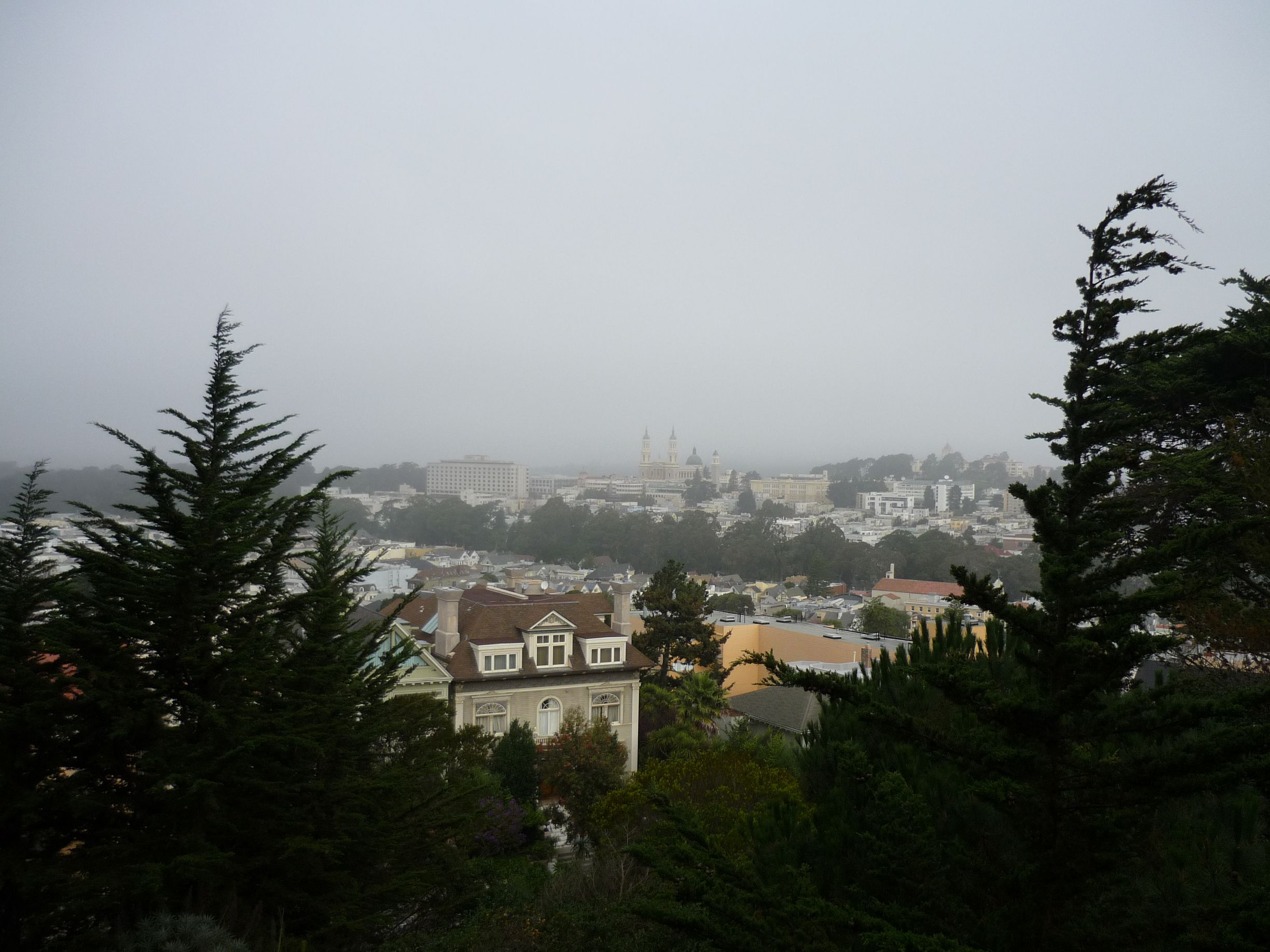 Aujourd’hui direction The Haight, un quartier hippie à l’origine, juste à l’est de Golden Gate Park. Je prends le bus 7 à 8h et arrive devant Buena Vista Park à 8h30. Ce parc est vraiment sublime, tout en hauteur, planté de très beaux arbres avec des vues magnifiques sur toute la ville. Je ne pense malheureusement pas que les photos rendront justice au lieu, le brouillard du matin n’empêche pas les contre-jours…