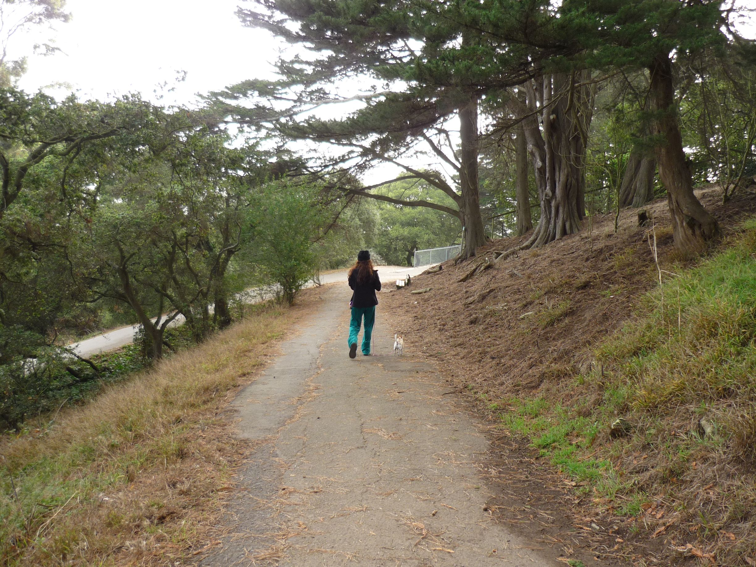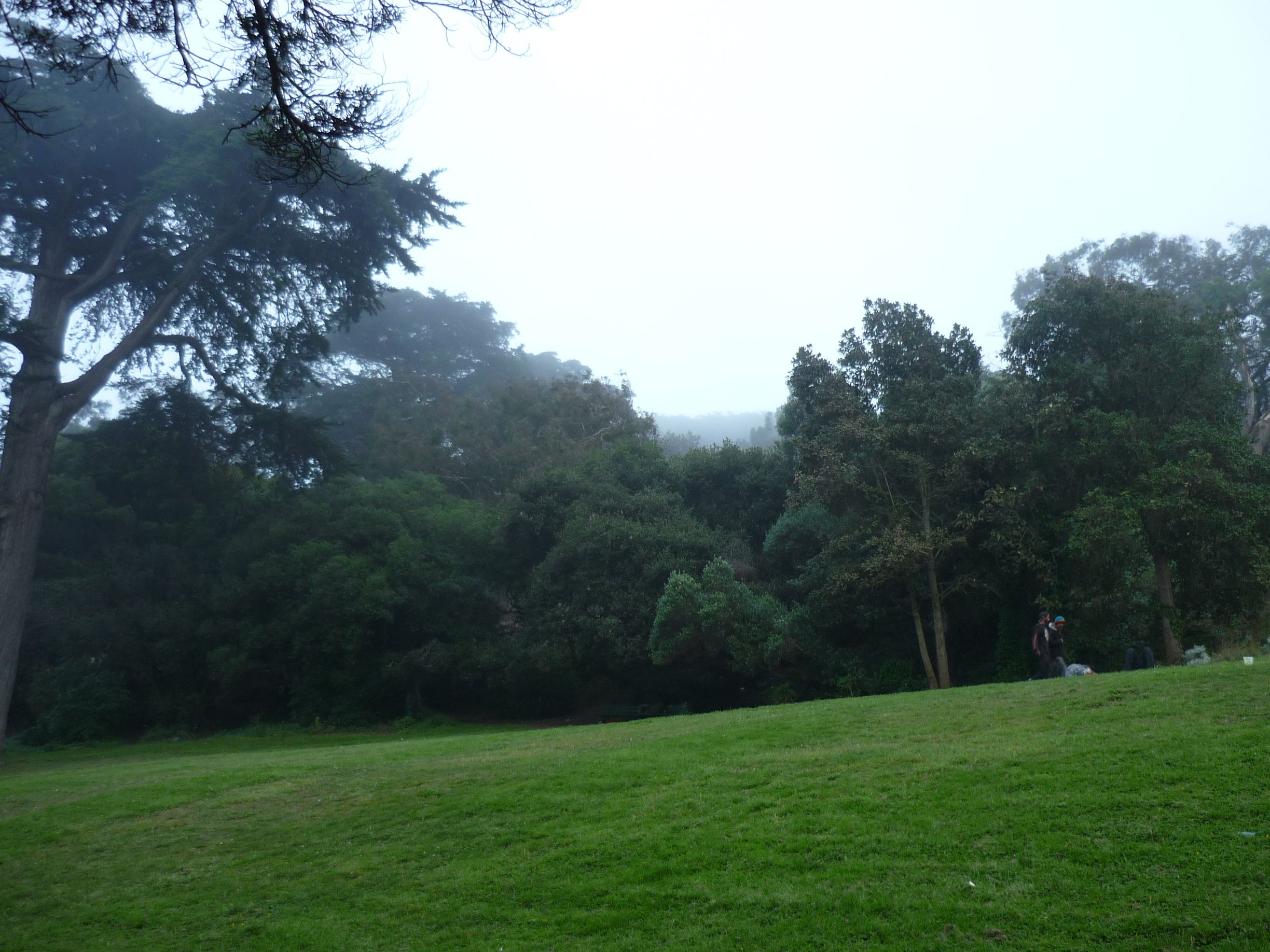 Pas mal de résidents promènent leur chien et le font jouer et courir. J’ai vu quelques beaux oiseaux, dont un qui ressemblait à un aigle. Je suis actuellement au niveau de Lyon Street dans le panhandle, un grand parc tout en longueur situé juste avant le Golden Gate Park. Le brouillard commence à se dissiper, je vais bientôt pouvoir enlever mon pull !