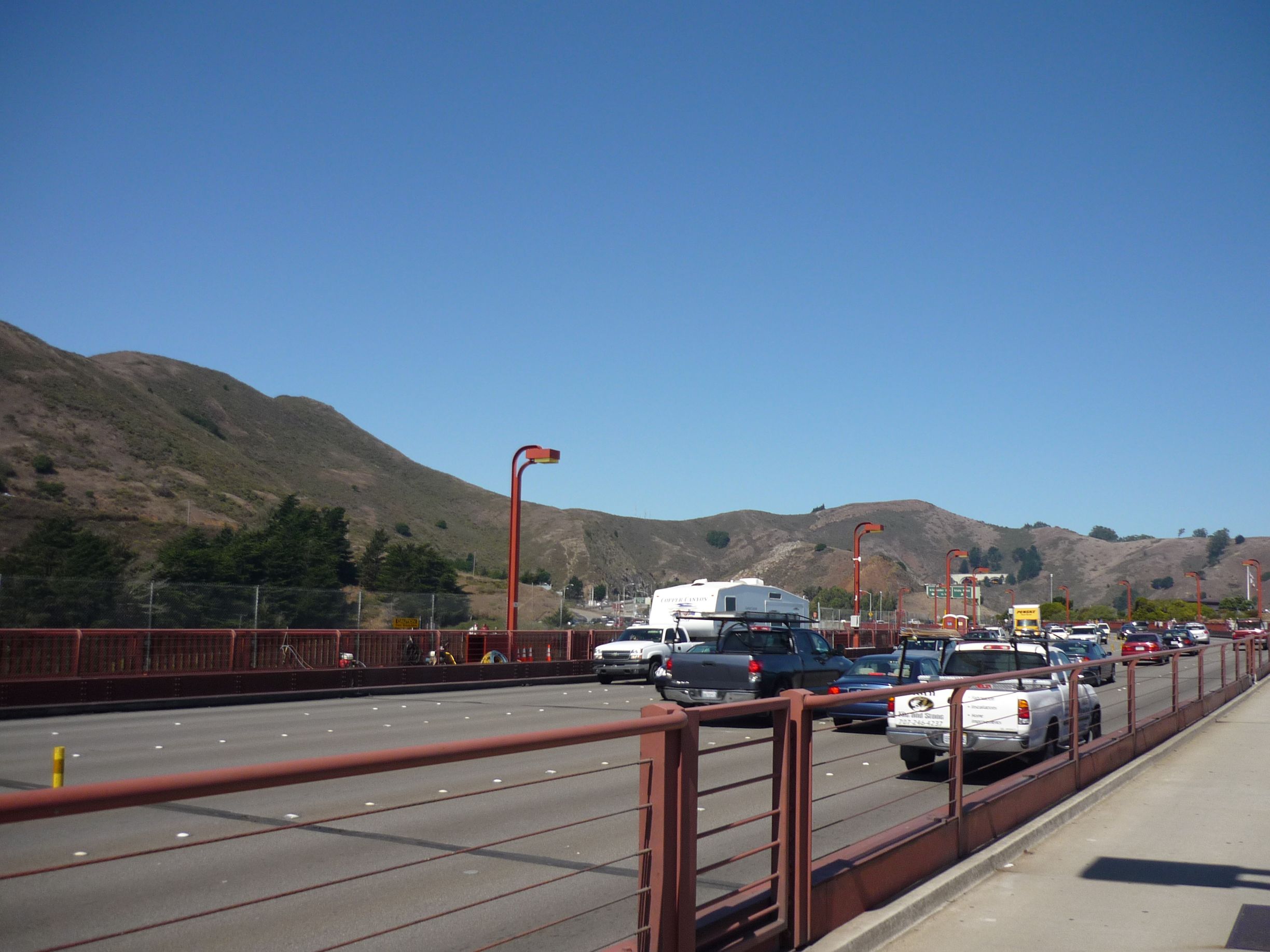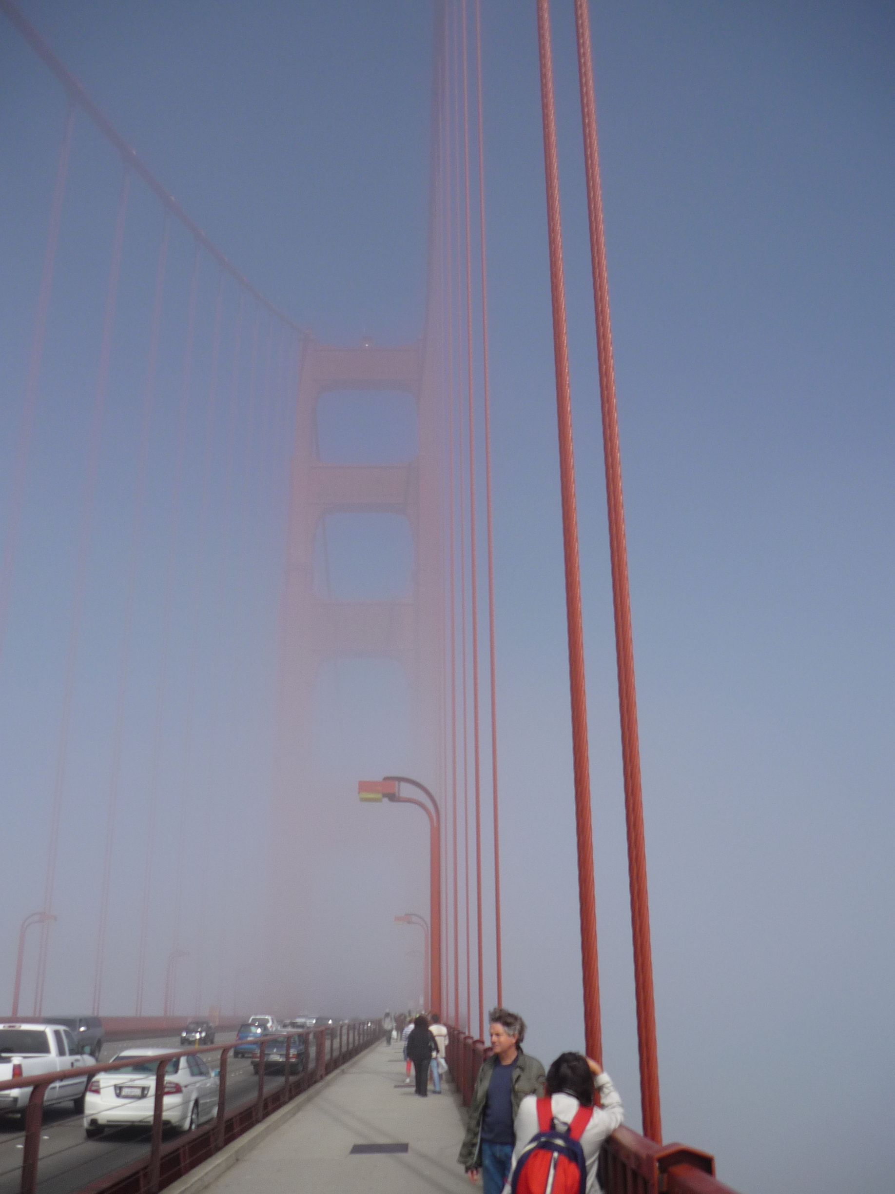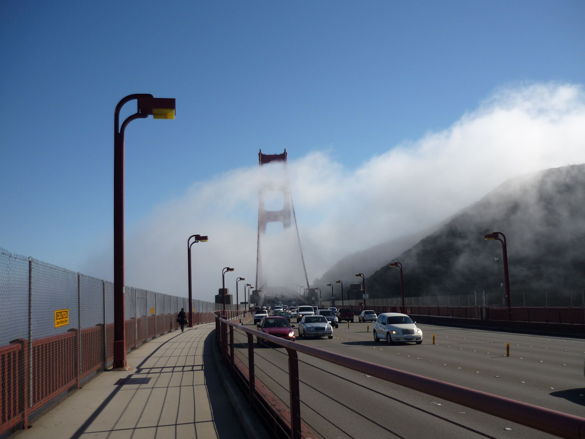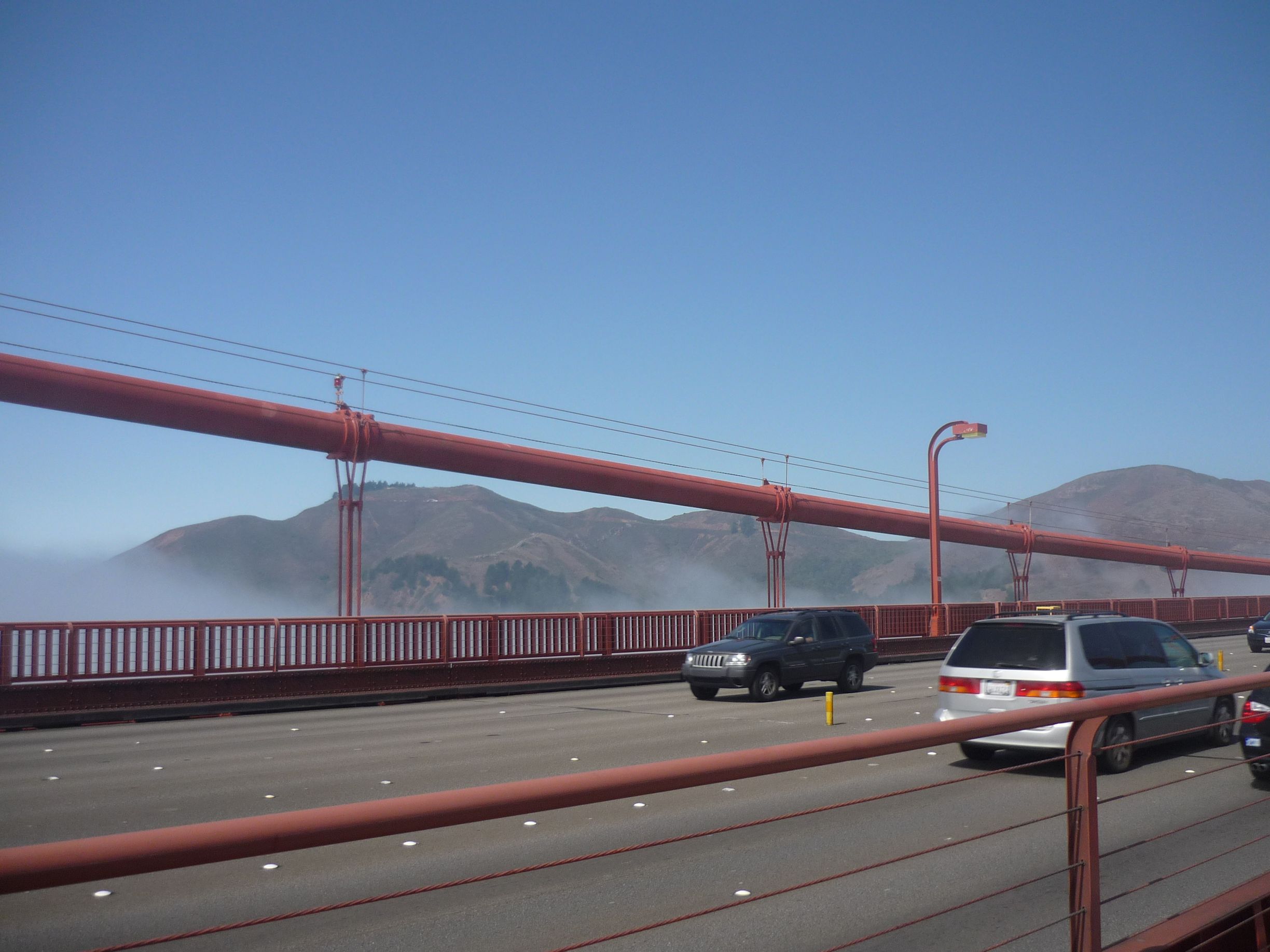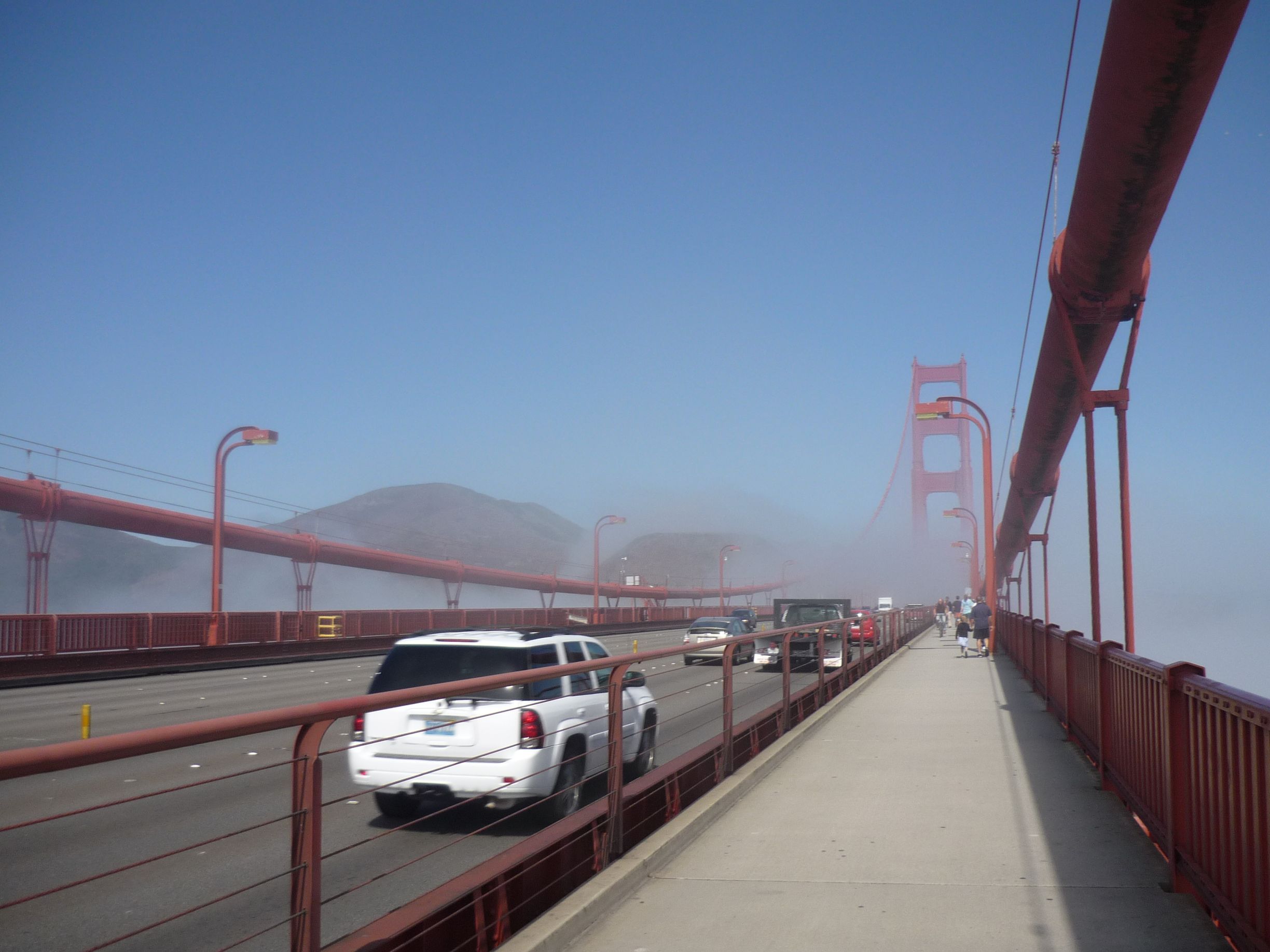 Direction le Golden Gate Bridge, sous le soleil de Californie. Malheureusement le pont est dans le brouillard, ce qui est normal apparemment ici mais un peu décevant pour les photos au pied du pont… Je monte donc afin de rouler sur le pont et, au fur et à mesure de mon avancée, le brouillard se lève, ce qui me permet de prendre quelques photos tout de même. Il y a pas mal de monde qui marche et c’est bien souvent plutôt du zig-zag que je suis obligé de faire, ne pouvant emprunter la voie pour voitures, mais c’est tout de même agréable. Ce n’est pas tous les jours que j’aurai l’occasion d’emprunter ce pont !