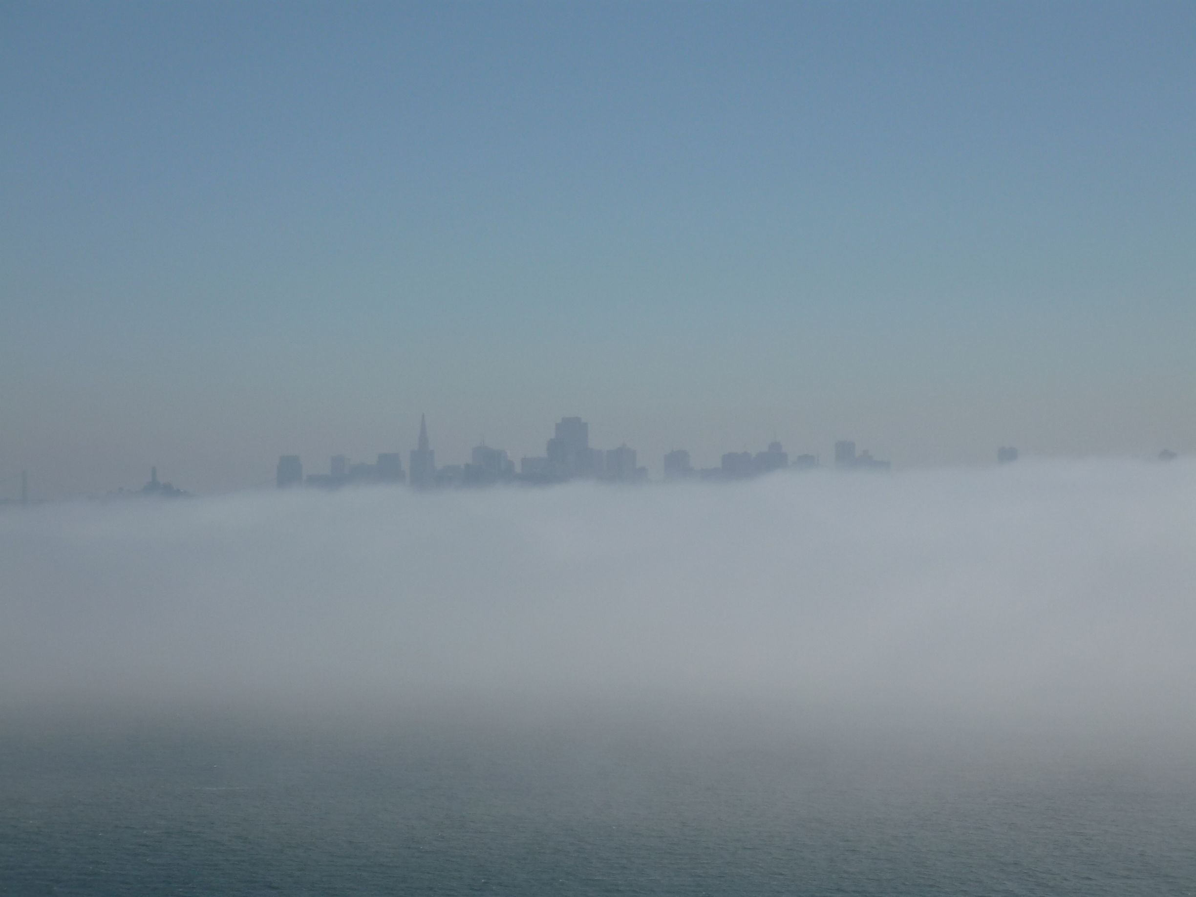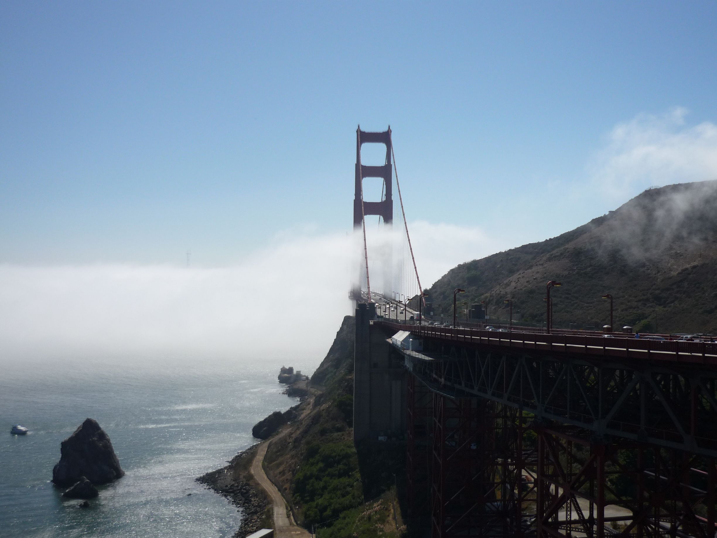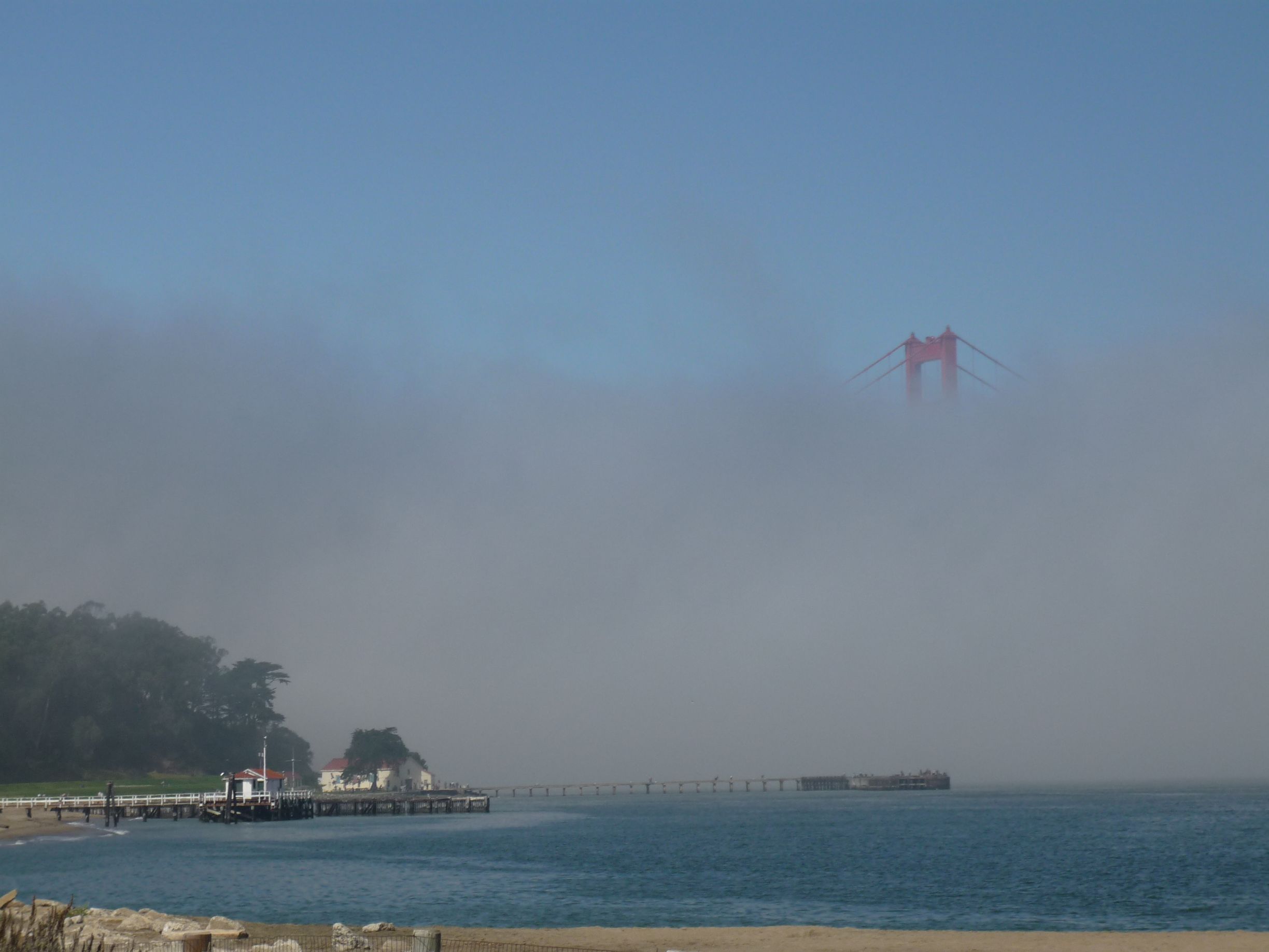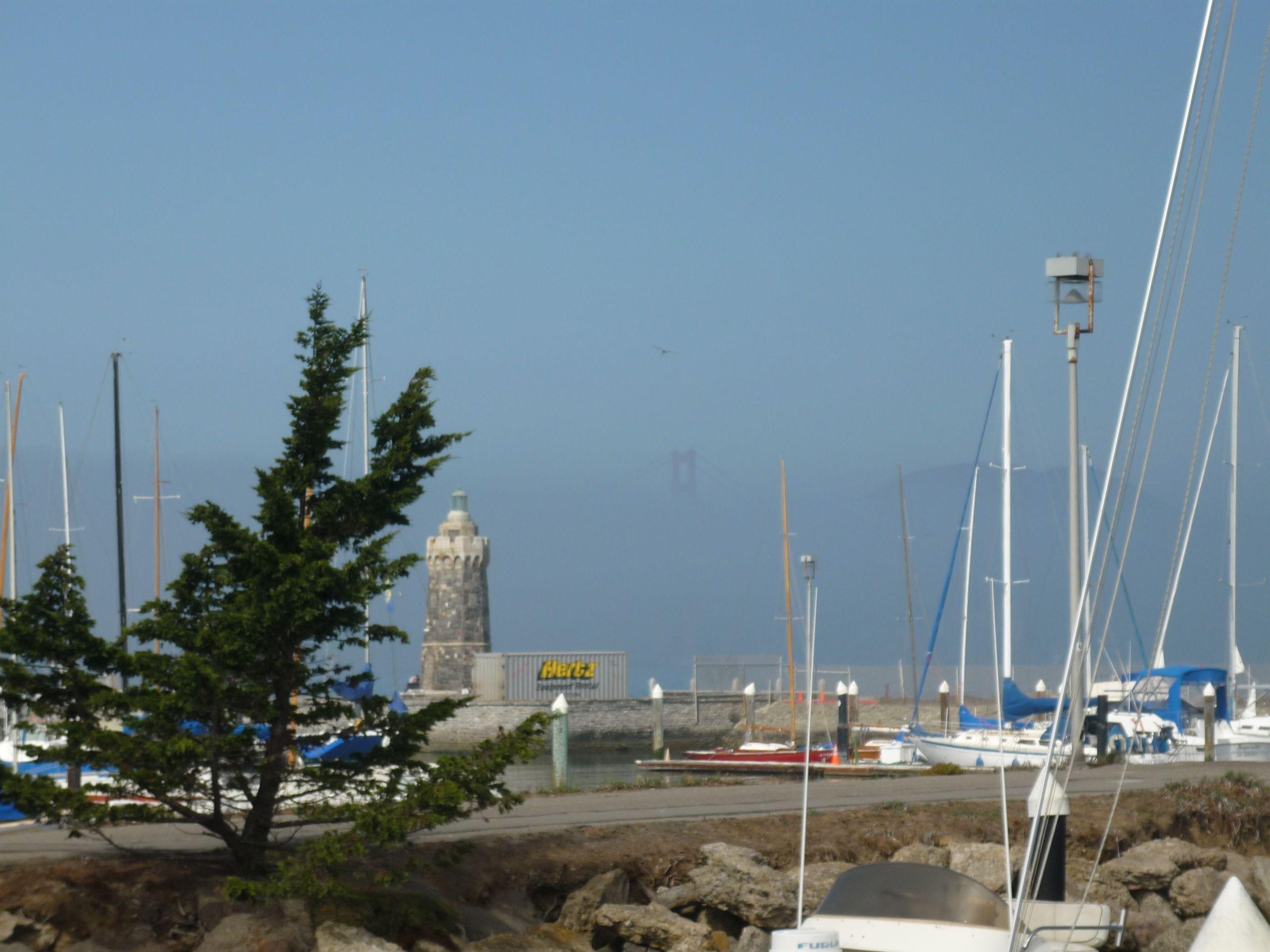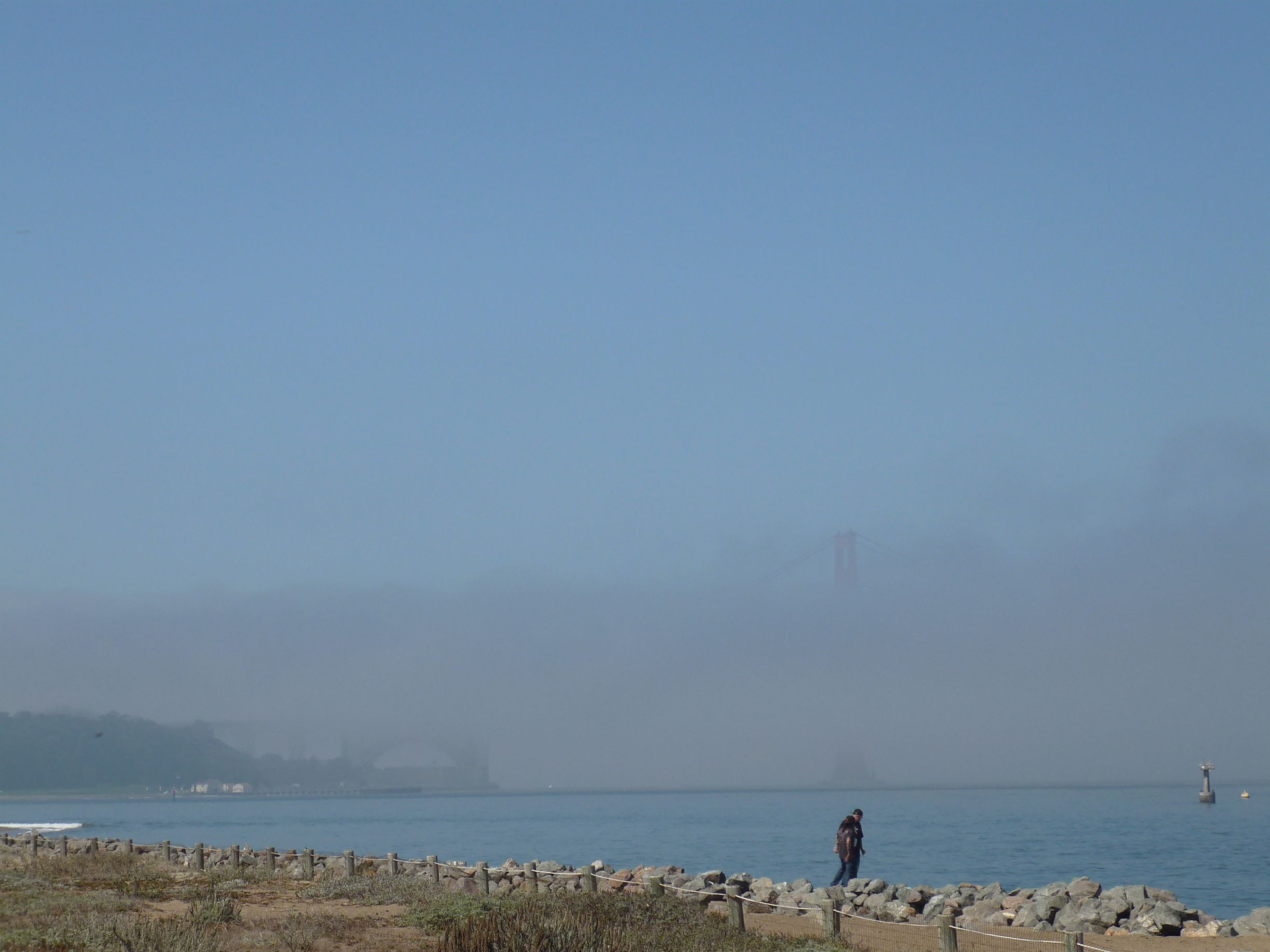 Direction le Golden Gate Bridge, sous le soleil de Californie. Malheureusement le pont est dans le brouillard, ce qui est normal apparemment ici mais un peu décevant pour les photos au pied du pont… Je monte donc afin de rouler sur le pont et, au fur et à mesure de mon avancée, le brouillard se lève, ce qui me permet de prendre quelques photos tout de même. Il y a pas mal de monde qui marche et c’est bien souvent plutôt du zig-zag que je suis obligé de faire, ne pouvant emprunter la voie pour voitures, mais c’est tout de même agréable. Ce n’est pas tous les jours que j’aurai l’occasion d’emprunter ce pont !