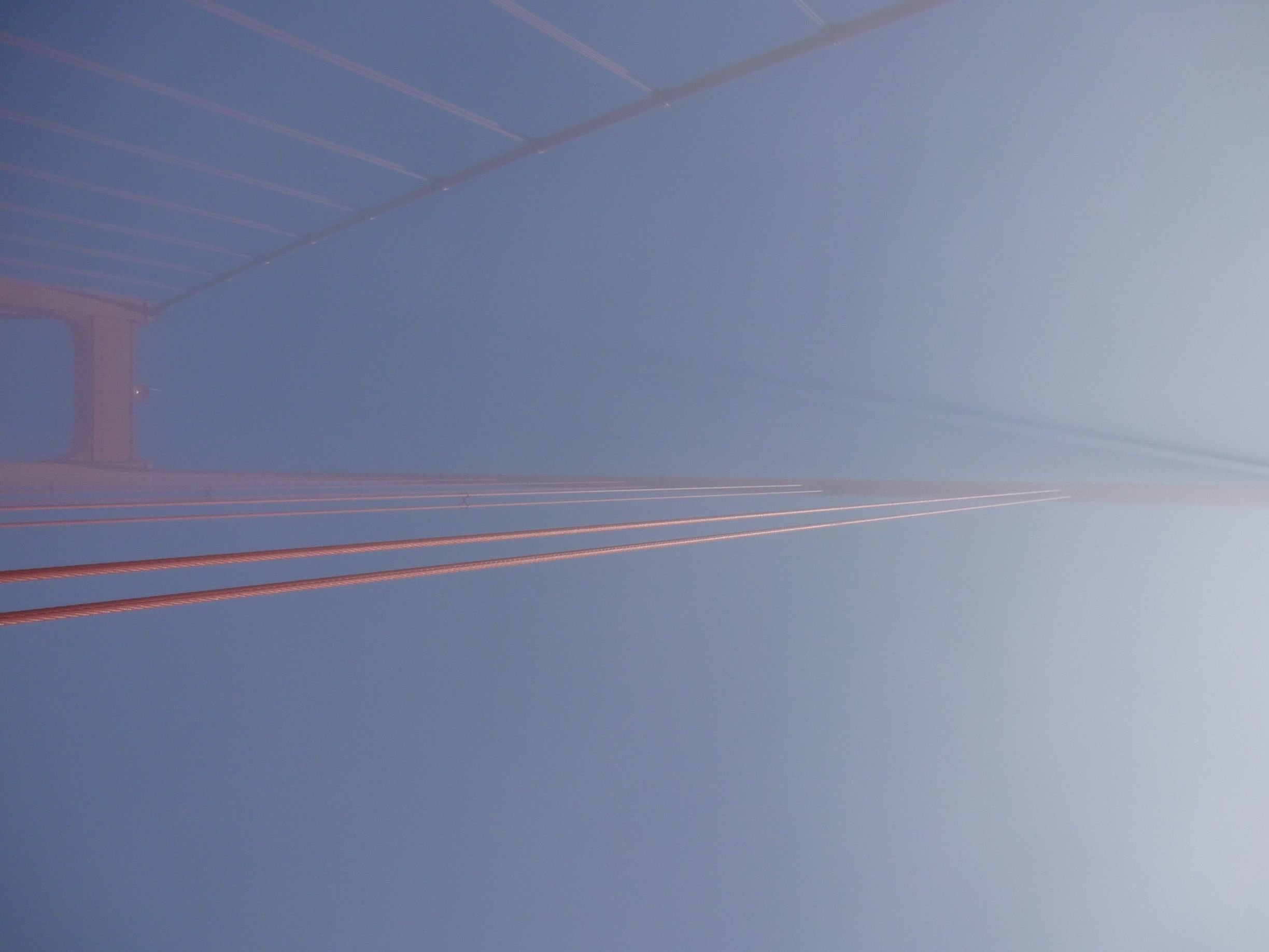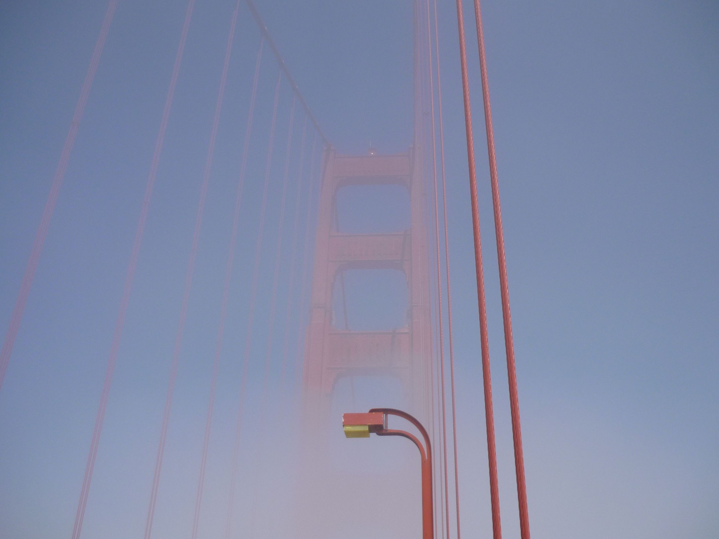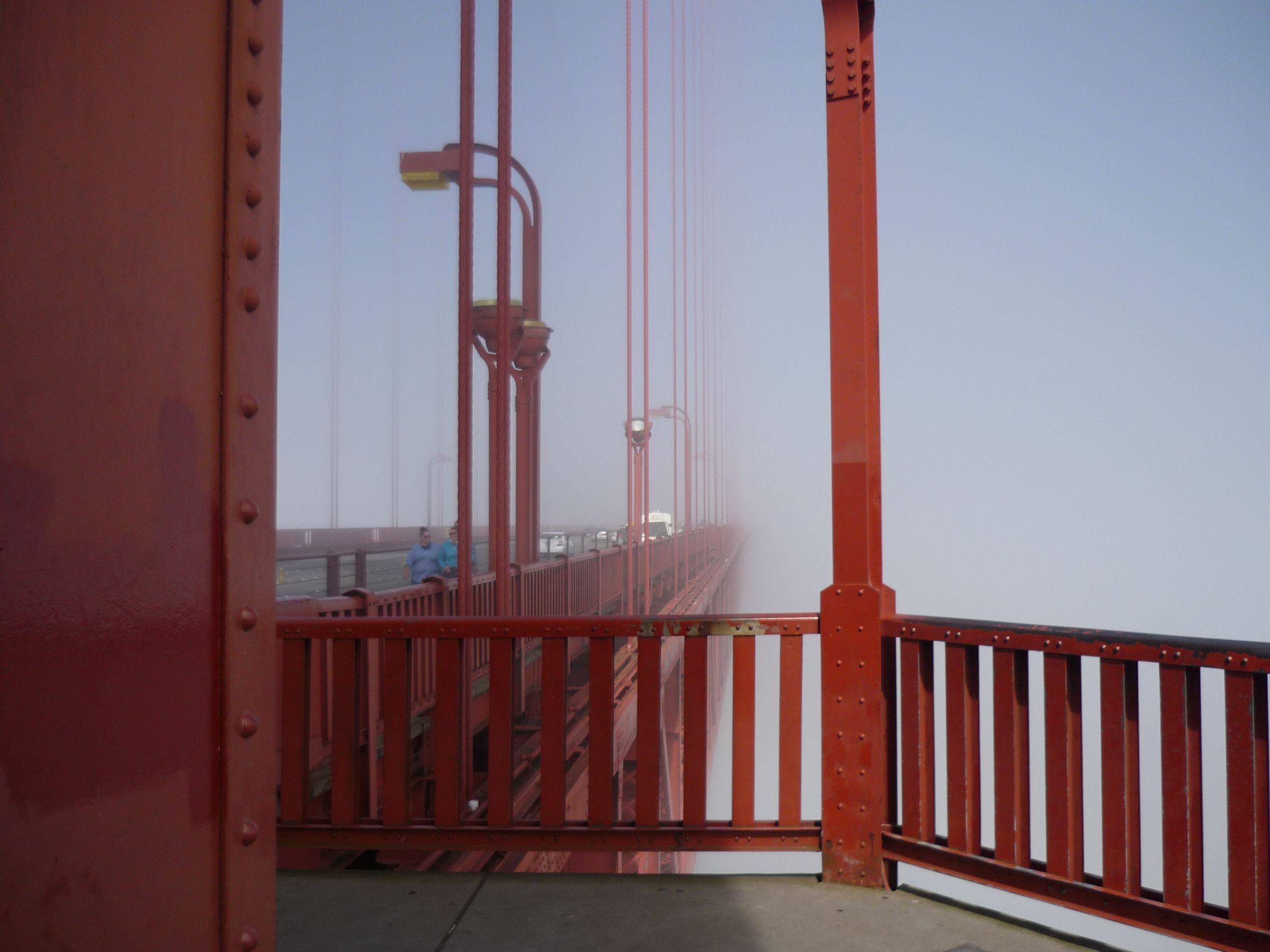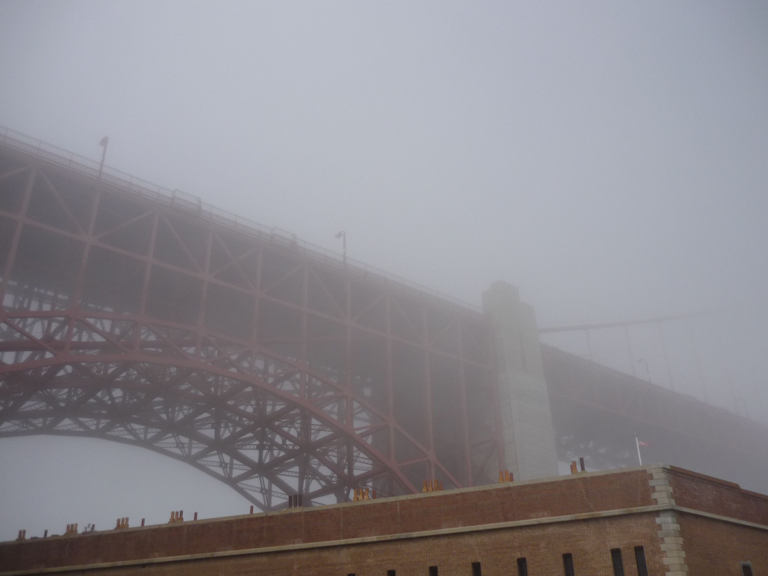 Après avoir vu cela, je repars en direction du pont. Évidemment, les super descentes de l’aller se sont transformées en côtes épuisantes ! Avec le soleil qui tape en plus, la remontée vers le Golden Gate Bridge n’est pas des plus reposantes… Par contre, une fois sur le pont, quel contraste ! Le vent violent et le brouillard se combinent : j’ai vraiment froid ! Heureusement que je suis à vélo, même si j’ai l’impression de monter une côte tant le vent contraire est violent…