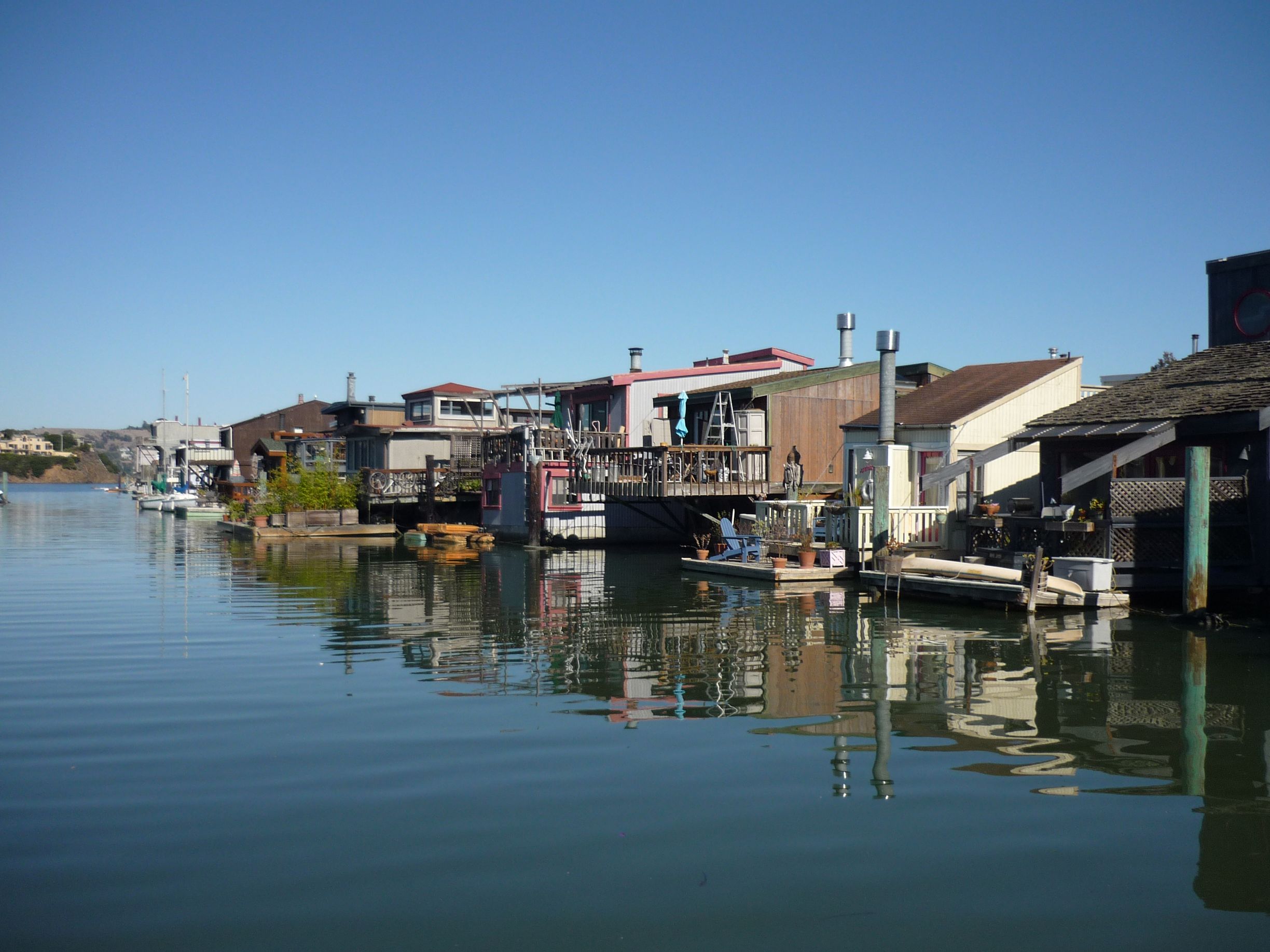 Après cette bonne pizza, je reprends mon vélo, histoire d’explorer un peu plus la côte. Je finis par arriver à la Houseboat Marina. Il s’agit d’un groupement de maisons flottantes, assez belles et, comme dans beaucoup de quartiers de San Francisco, peintes de toutes les couleurs. Ce doit être assez spécial de vivre là dedans ; j’imagine qu’ils ne doivent pas avoir de problèmes de pièces trop sèches au moins…