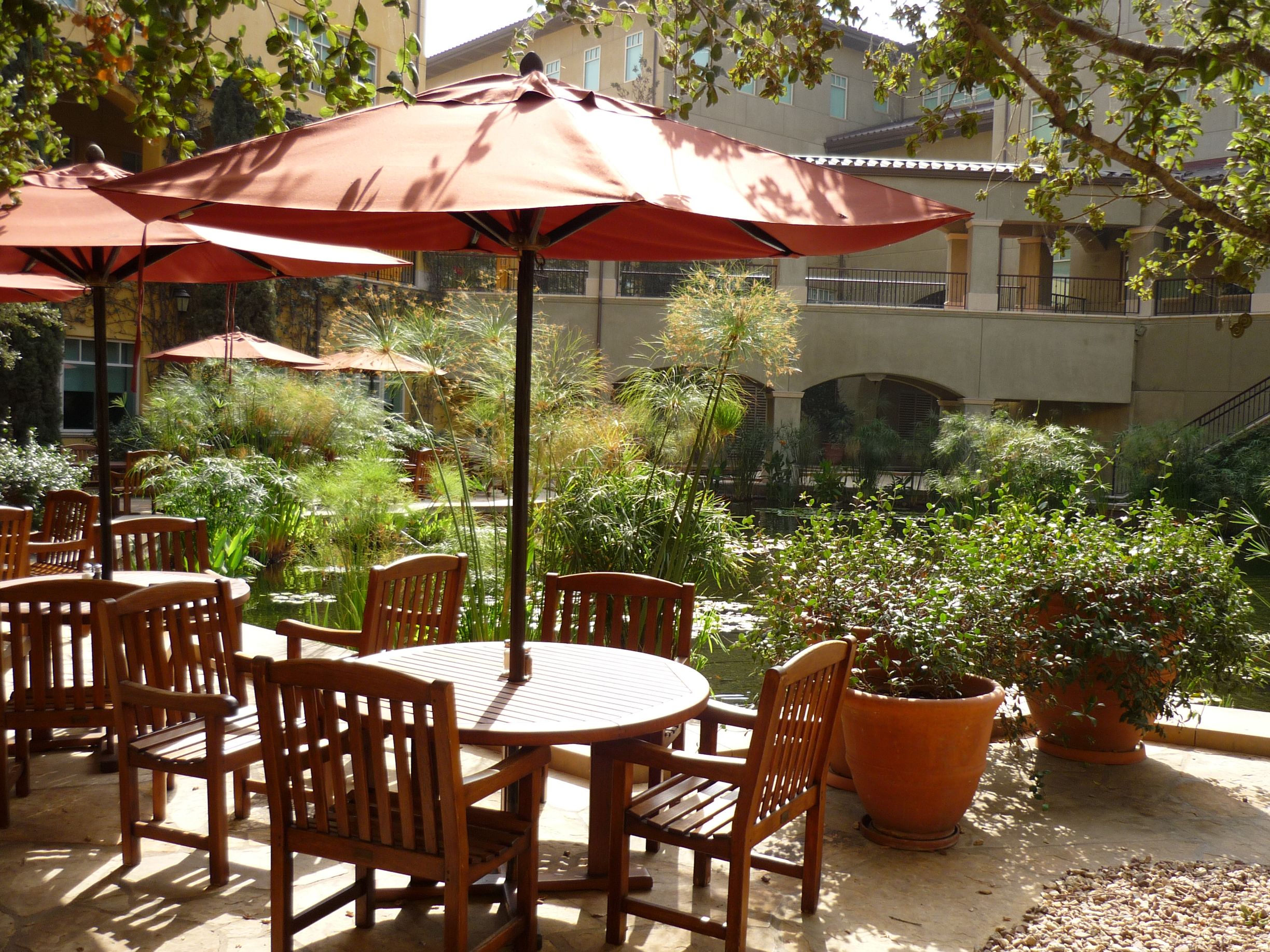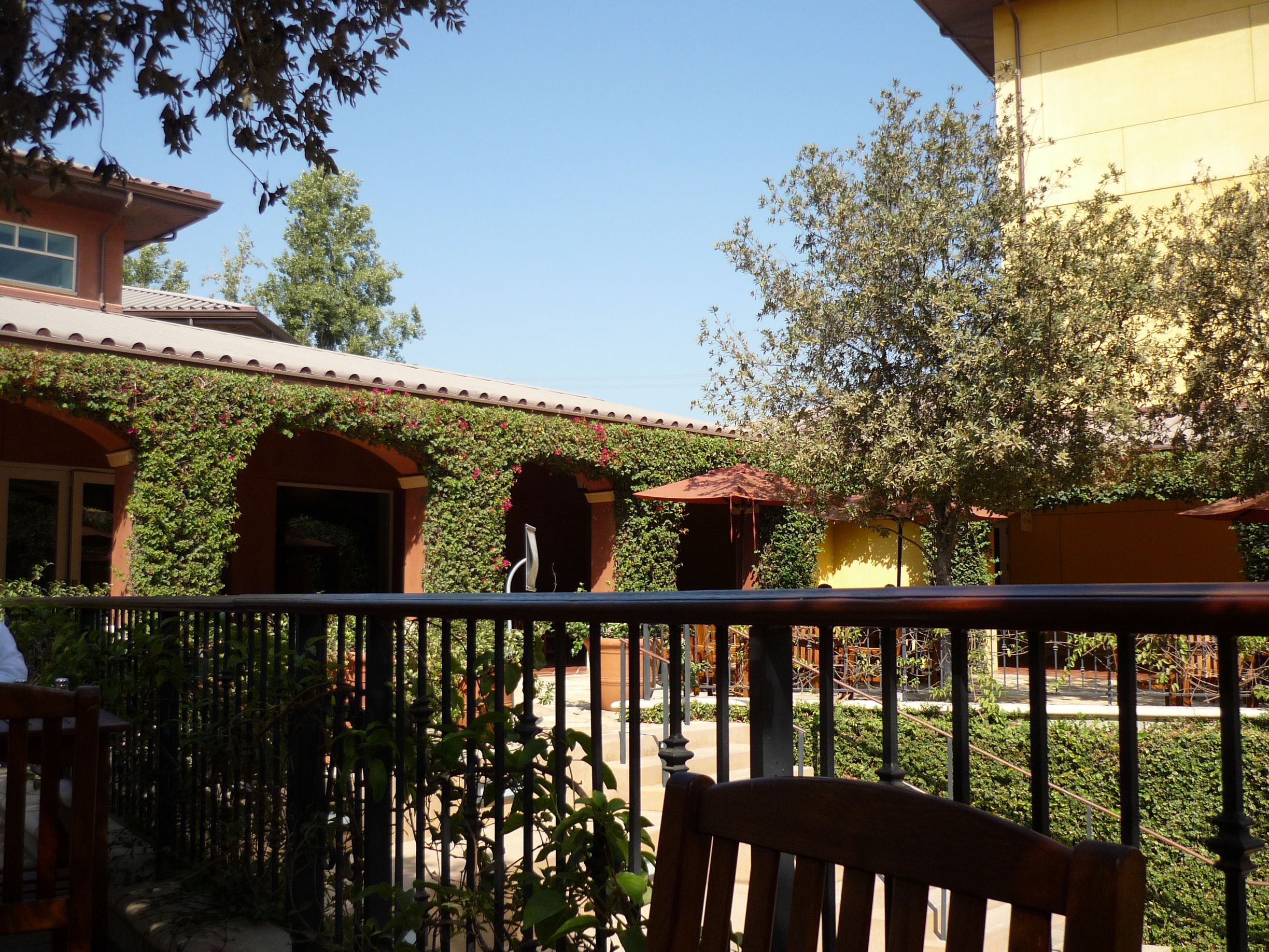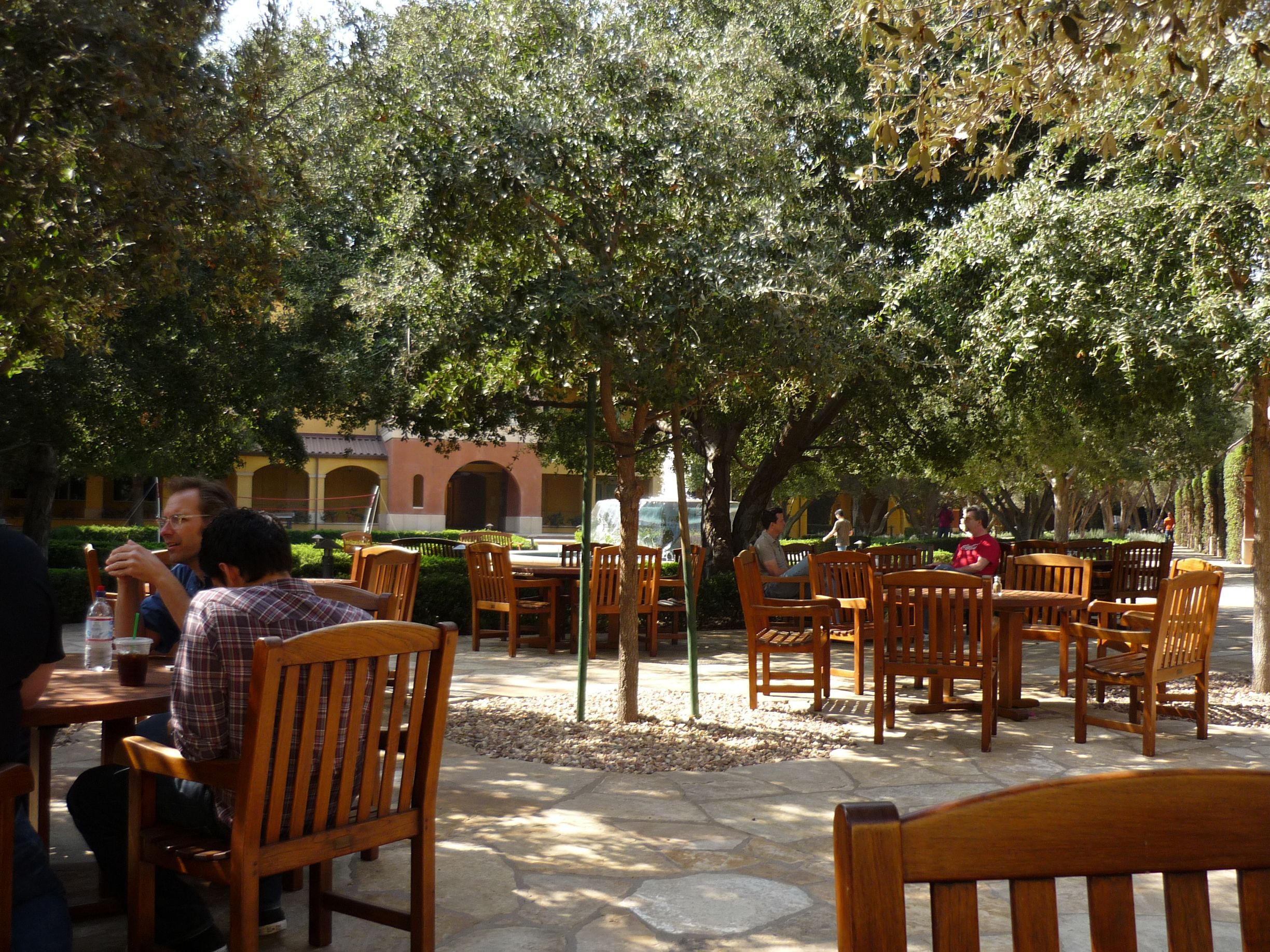 On arrive juste à temps pour le repas, pas mauvais du tout, que l’on prend à l’extérieur, sur une terrasse pleine d’arbres avec fontaine. C’est vraiment un endroit superbe ! On a une conversation un peu geek mais très agréable, le repas consiste en du poulet avec des pommes de terre, une entrée composée de tout ce que l’on souhaite (on se sert) et en dessert une sorte de gâteau pas mauvais du tout. Après avoir mangé, nous nous dirigeons vers la salle d’arcade avec des sièges baquet à retour de force (mais on n’arrive pas à démarrer le jeu), une table de billard, des consoles de jeu…