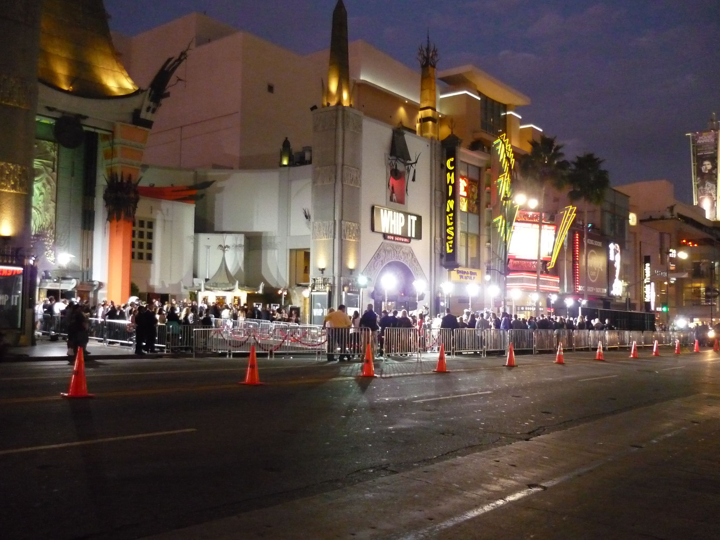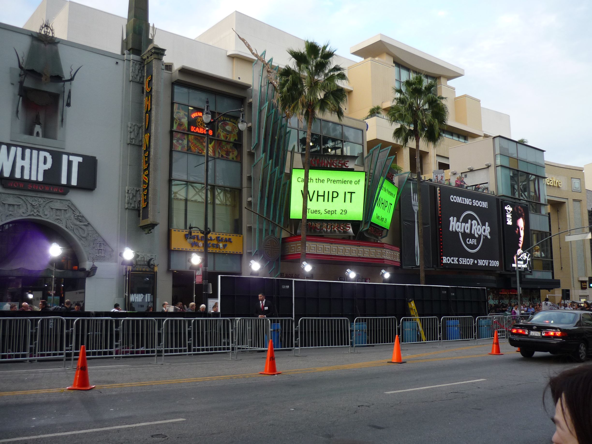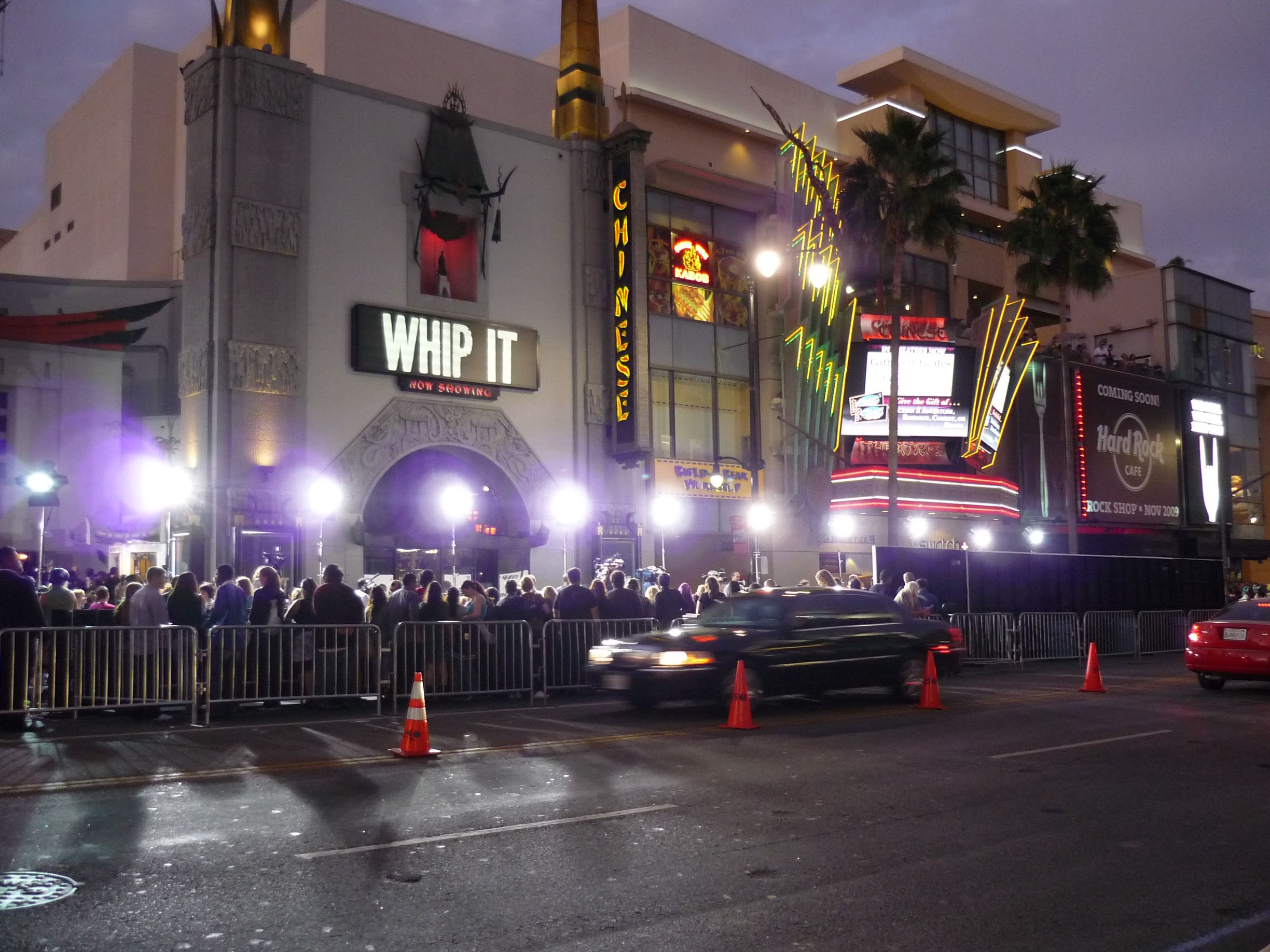 J’en profite pour acheter une carte postale pour Caro et l’envoyer de Hollywood Boulevard. En continuant à remonter le boulevard, je vois, devant le Chinese Theater , des lumières, des bannières temporaires, des gardes du corps et un mur pour prendre des photos. Cela sent l’arrivée de stars et je me dis qu’après tout, je serai pas à Hollywood tous les jours, donc j’attends devant le cinéma, de l’autre côté de la rue. Le film projeté est Whip It. Ils font venir progressivement des gens aux premières loges : juste après le mur des photos, au niveau du tapis posé devant l’entrée.