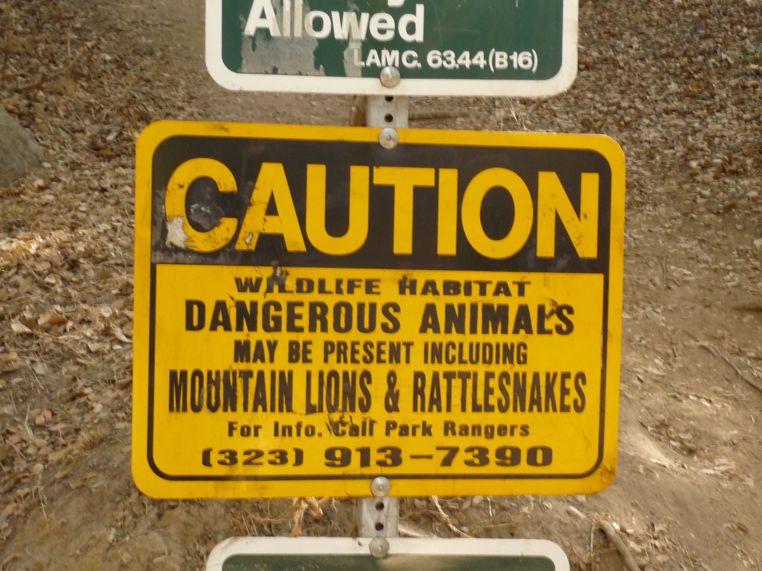 Griffith Park est vraiment sec, je comprends facilement comment autant d’hectares ont pu brûler cet été aux abords de Los Angeles : l’herbe est toute jaune, desséchée, et les arbres et arbustes semblent morts pour la plupart. Ils annoncent d’ailleurs, à l’entrée du parc, que le risque d’incendie est très élevé. Un autre panneau nous rappelle que cet endroit est sauvage et qu’il est possible de croiser des mountain lions et des rattlesnakes, je vais faire attention !