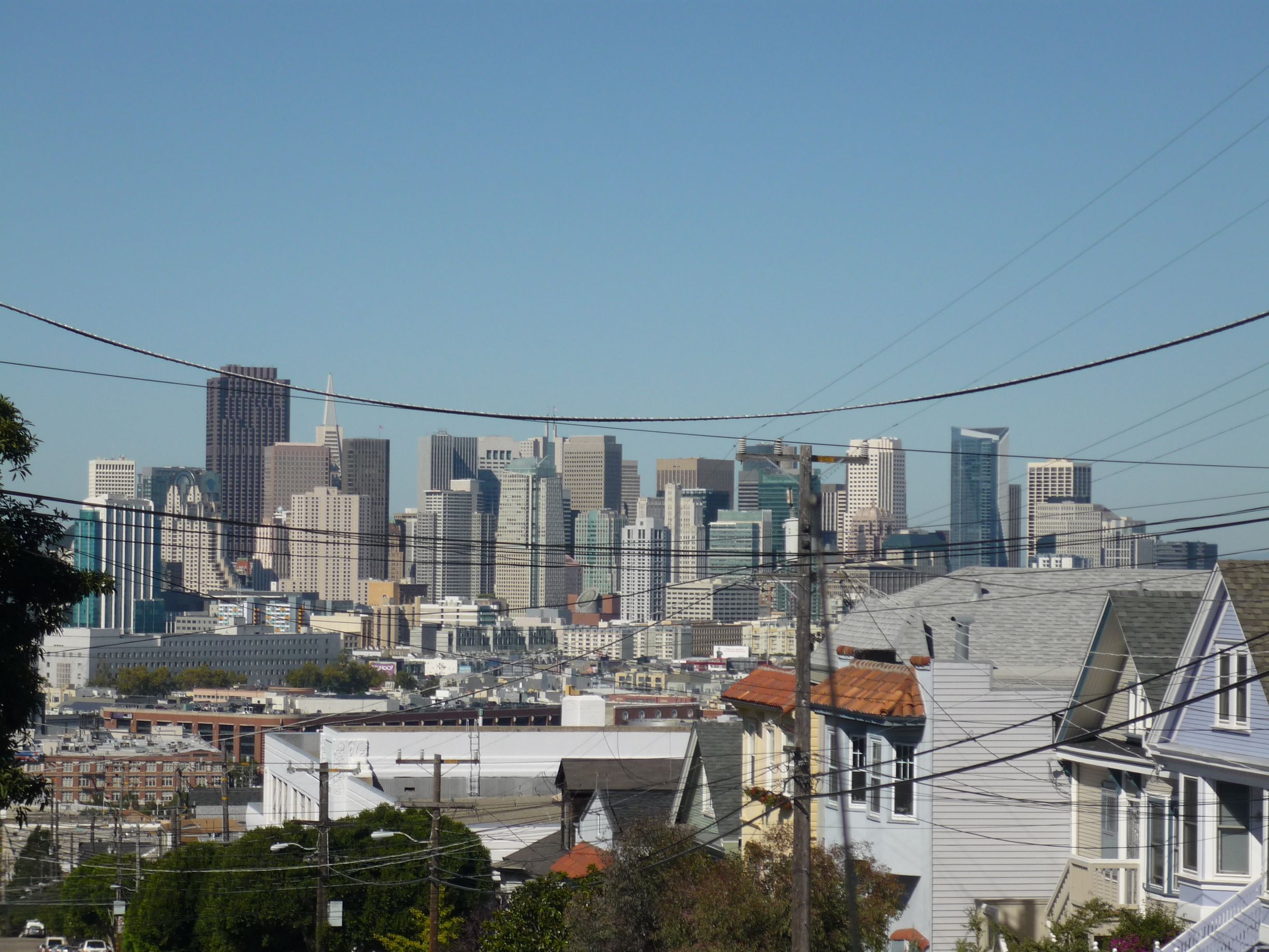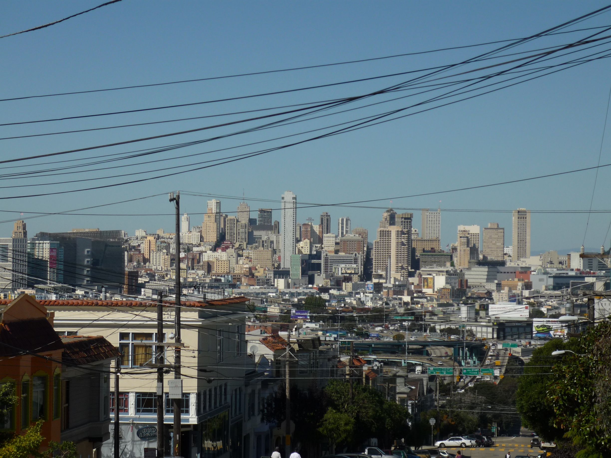 J’avais vu, en arrivant, que le bus 38 passait tout près. Je me rends à l’arrêt et demande à une jeune fille s’il va bien dans la bonne direction. Elle me dit que oui mais, pour Market, elle connaît une route bien, qu’elle prend elle-même régulièrement, et me demande de la suivre. On discute un peu et elle m’apprend qu’elle vient de Panama, et qu’elle s’est installée à San Francisco pour devenir make-up artist.